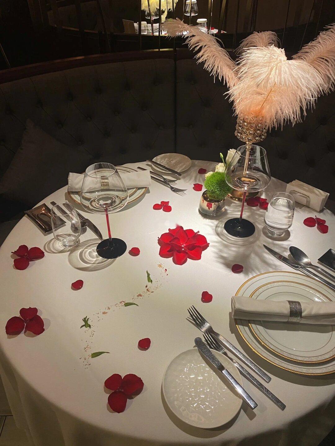 和朋友一起庆祝升学 吃到了超满意的晚餐🍷 秋季很多特色菜品上新 玫瑰花瓣和灯光布置也很浪漫 好适合拍照 氛围感拉满~