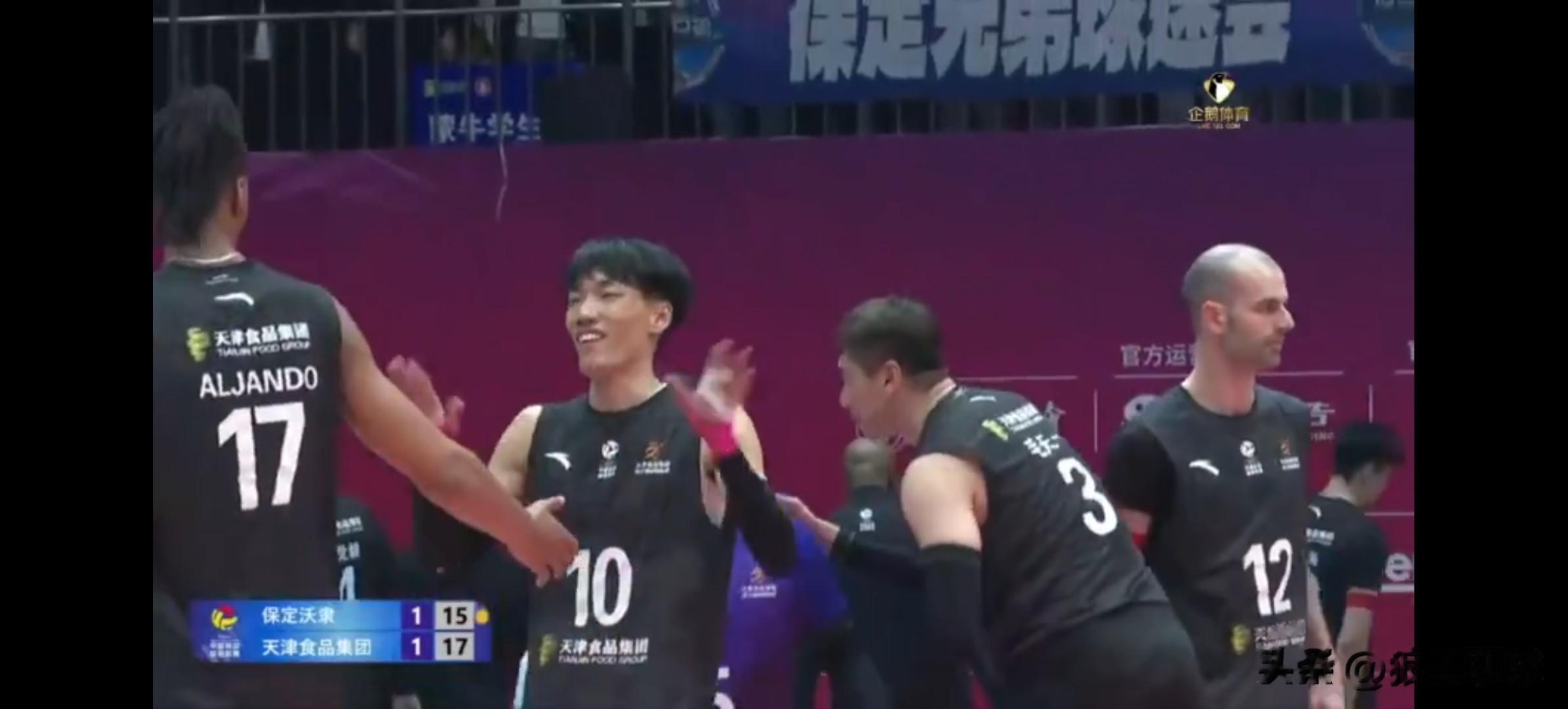 换上杨宝琪发球,阿利进攻打中20-23,河北拦网得分21-23。一传到位,阿利进攻得分21-24,温子华进攻打手出界22-24,温子华打手出界23-24,天津暂停。关键一传要到位,把球给阿利就行,重点盯阿利,阿利一锤定音打中,河北挑战界外,23-25。天津男排先输一局,连扳三局获胜,获得冠军,创造历史。
