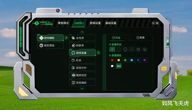 这款显示器还自带了多种“物理外挂”功能。比如智能准心,是非常有用的一个智能功能。可以在菜单里设置不同的准心形状,选择自己习惯的,从而更容易捕捉。同时可以选择颜色或者自动,选择自动的话,系统会自动选择一个对比更加明显的颜色。