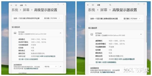 通过查看显示器模式,可以看到同一个显示器,分别运行在1920x1080 320Hz 和 3840x2160 160Hz的模式下。
