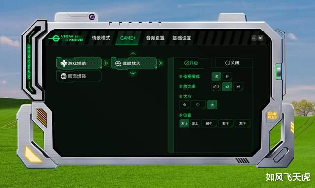 鹰眼放大也是很有用的一个功能,它的作用是将准心附近的画面放大,从而可以让没有狙击功能的武器都具有狙击的效果。放大后是一个方形框,有三档大小可以选择。同样可以选择狙击镜的倍数,有1.5、2、4三个倍率可以选择。同时可以选择放大框位置,包括是左上、左下、右上、右下和居中。