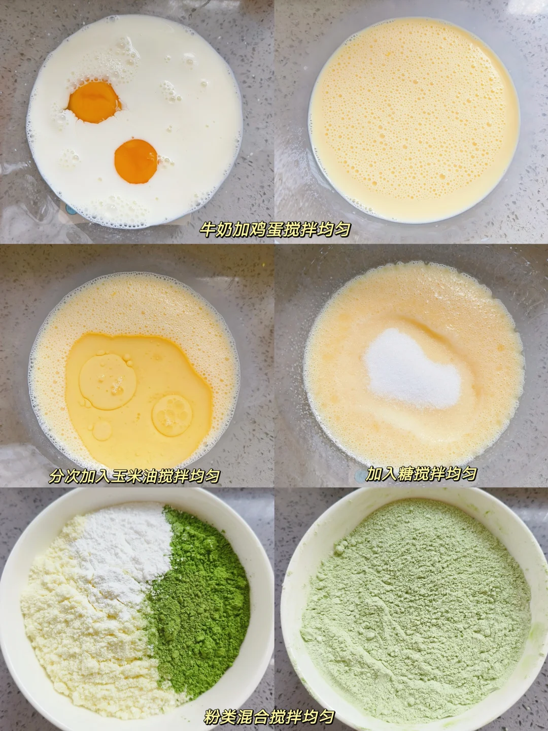 [四R]低粉+抹茶粉+奶粉+泡打粉混合均匀,筛入体液中搅拌均匀