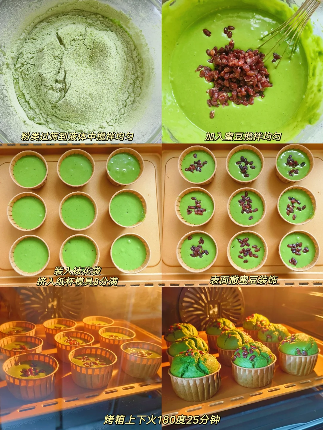 [彩虹R]低筋面粉200克,鸡蛋2个,牛奶160克,玉米油70克,奶粉30克,抹茶粉10克,泡打粉8克,糖80克,蜜豆100克