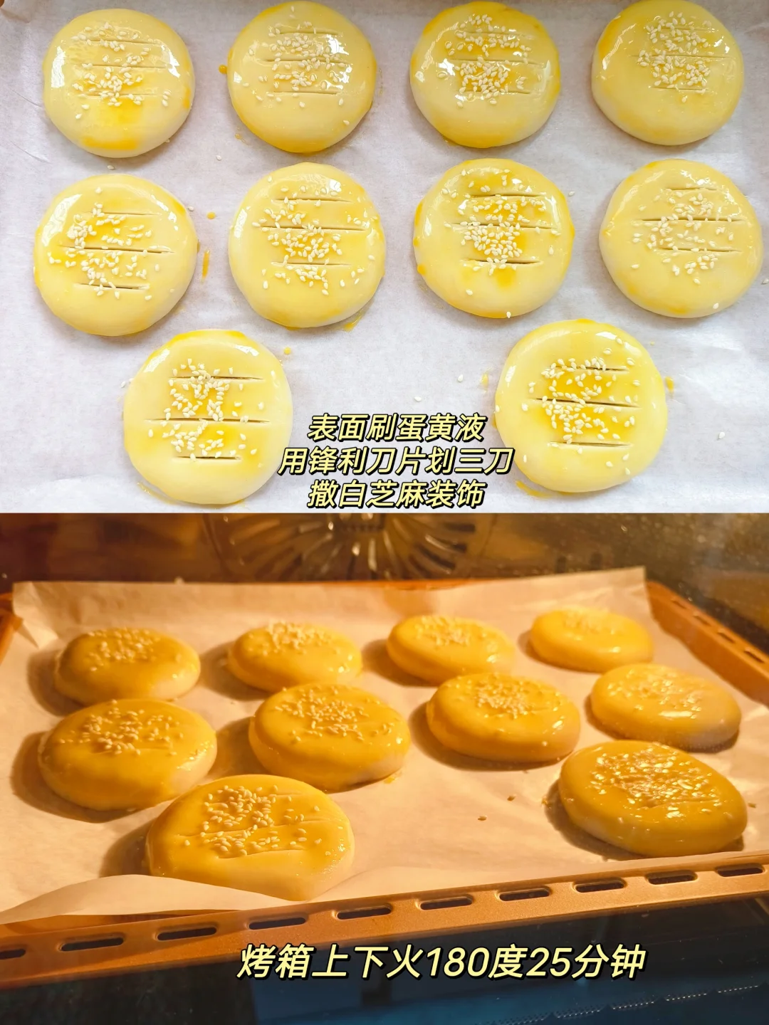 [九R]刷蛋黄液,锋利刀片割三刀,撒芝麻,烤箱上下火180度25分钟出炉
