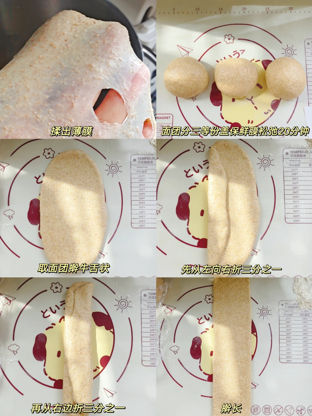 [三R]取面团擀成牛舌状,如图两边往中间对叠,擀长,翻面,从上向下轻轻卷起,放入模具,烤箱里面放一碗热水,35度发酵50分钟左右,发酵9分满。