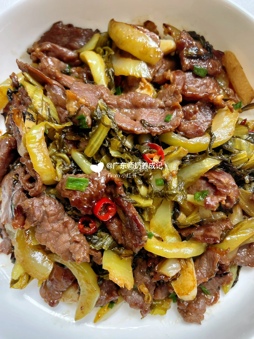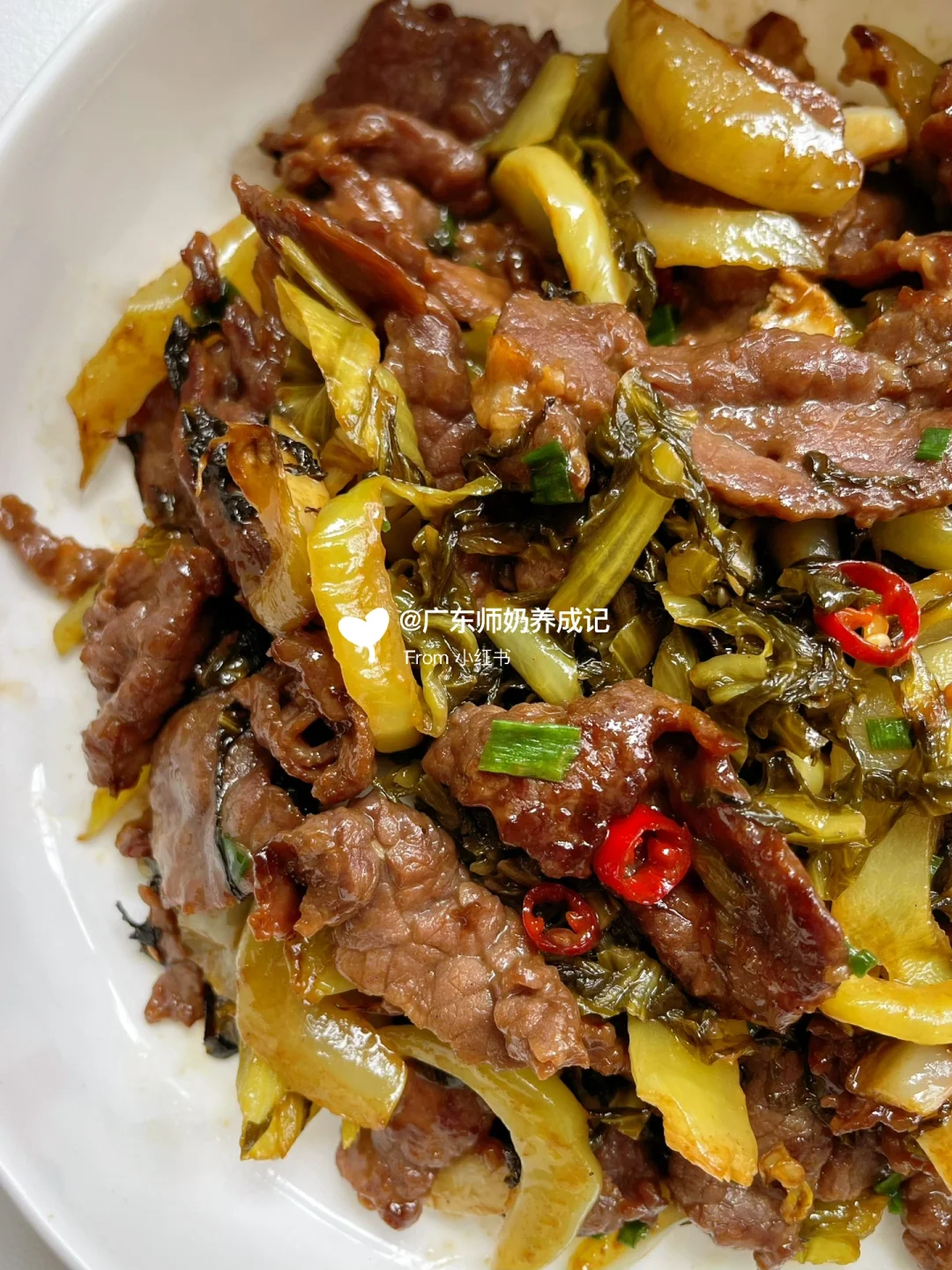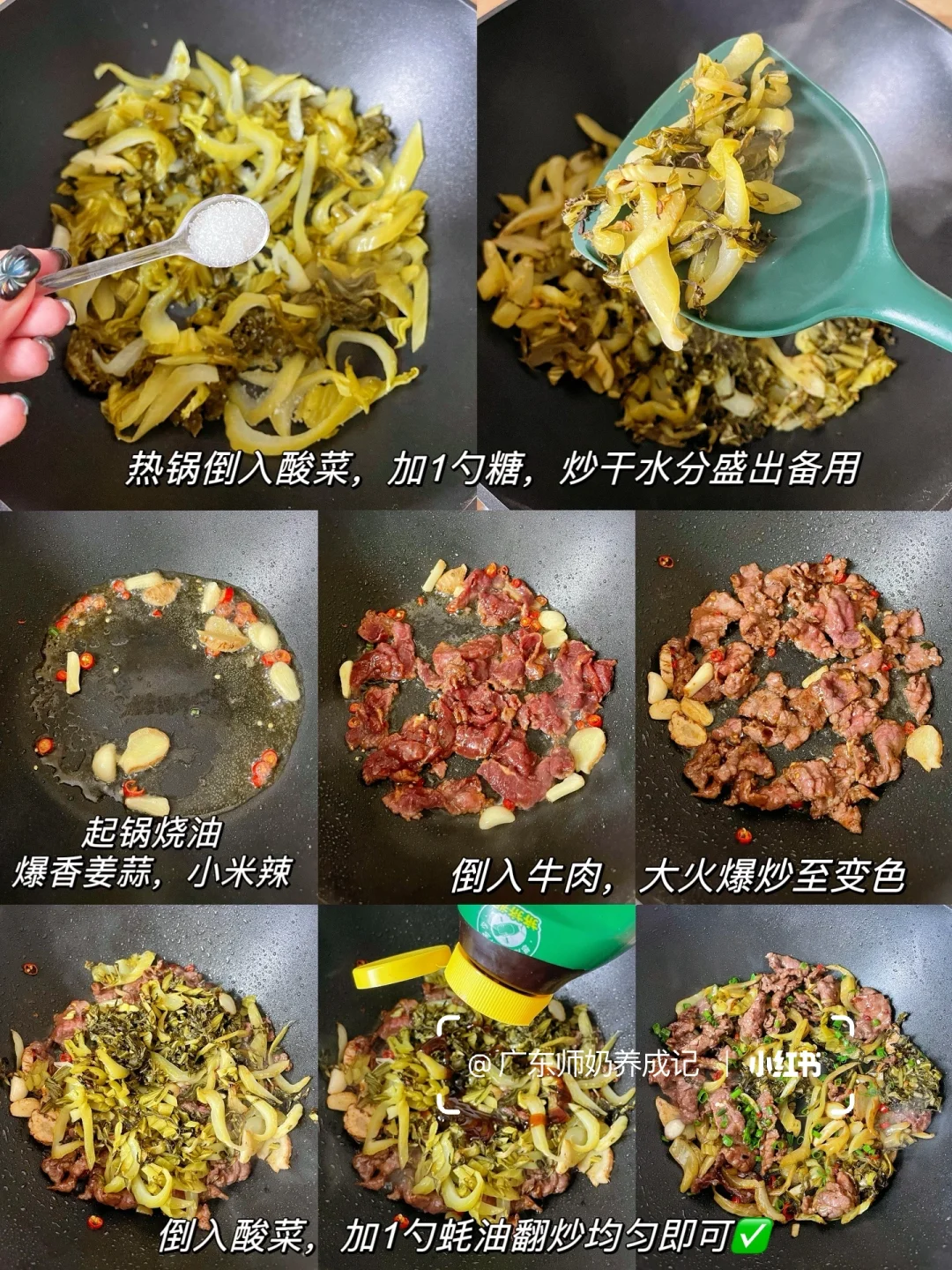 2️⃣另起锅烧油,爆香姜蒜和小米辣,倒入腌好的牛肉,大火爆炒变色,倒入酸菜,➕1勺蚝油翻炒均匀,撒入葱花即可✅