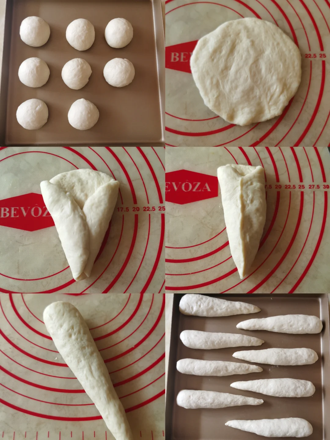 5. 取一个面团,拍扁,擀成三角形后,两侧分别向内折,呈一个锥形,接口捏合。双手轻搓成水滴形,头部不要太细,大约15cm长。