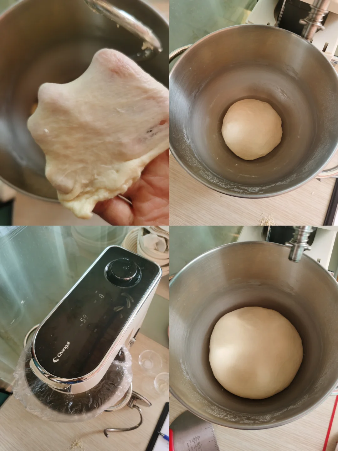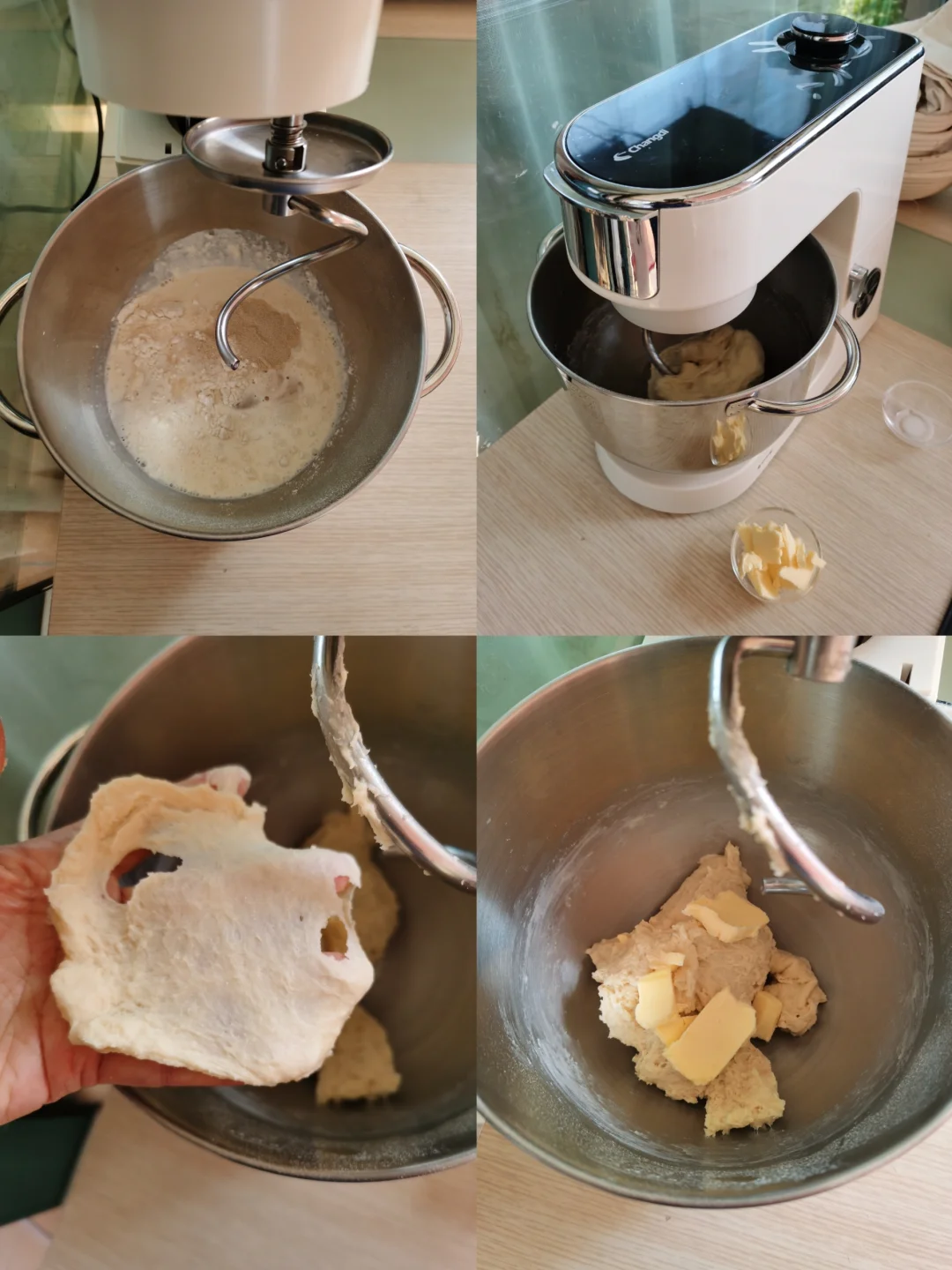 2. 开启厨师机进行揉面。不同厨师机操作的时间长短不一,我的是长帝企鹅顶顶,给大家参考一下:先用1档低速,搅拌面粉成团,大约2分钟,然而调到3档中速搅拌,面团表面逐渐光滑,直到面团开始不沾盆底,会啪啪甩到盆壁,大约10分钟,加入软化的黄油,用1档将面团与黄油揉至完全均匀,大约2分钟,最后调到4档,直到面团猛烈拍打盆壁,变得非常光滑,检查面团可以拉出均匀的薄膜即可,大约5分钟。