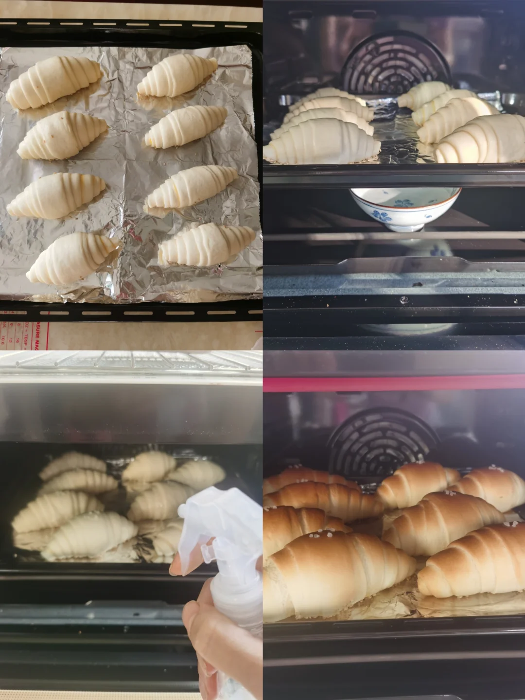 12. 发酵结束后,在海盐卷上蘸几粒海盐,放入预热好的烤箱,中下层,上火230度,下火190度,15分钟。入炉后,喷一些水气。