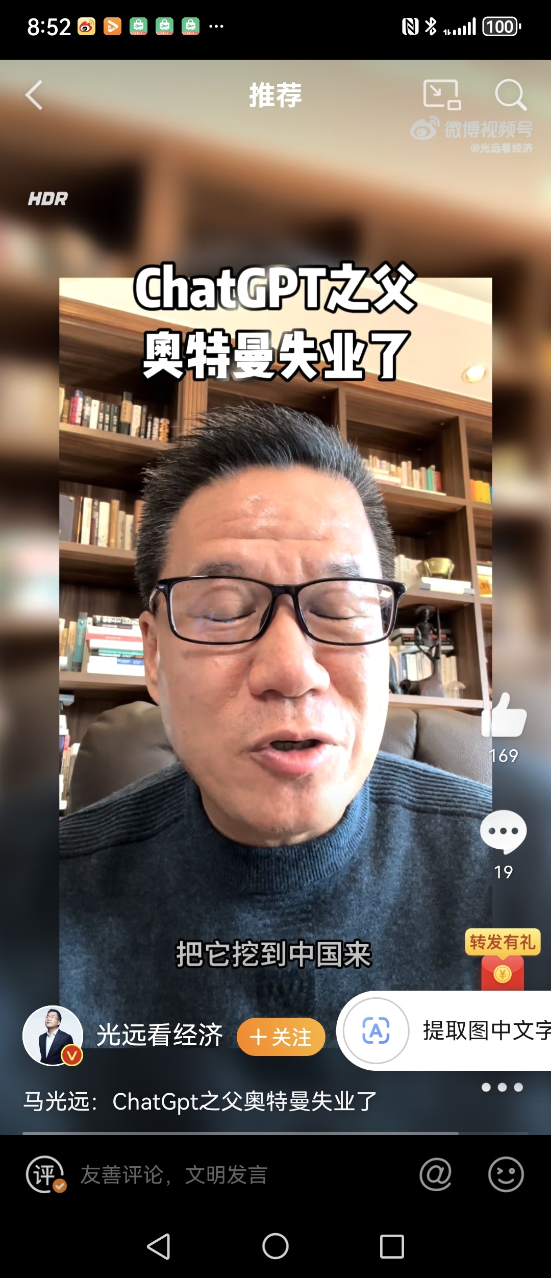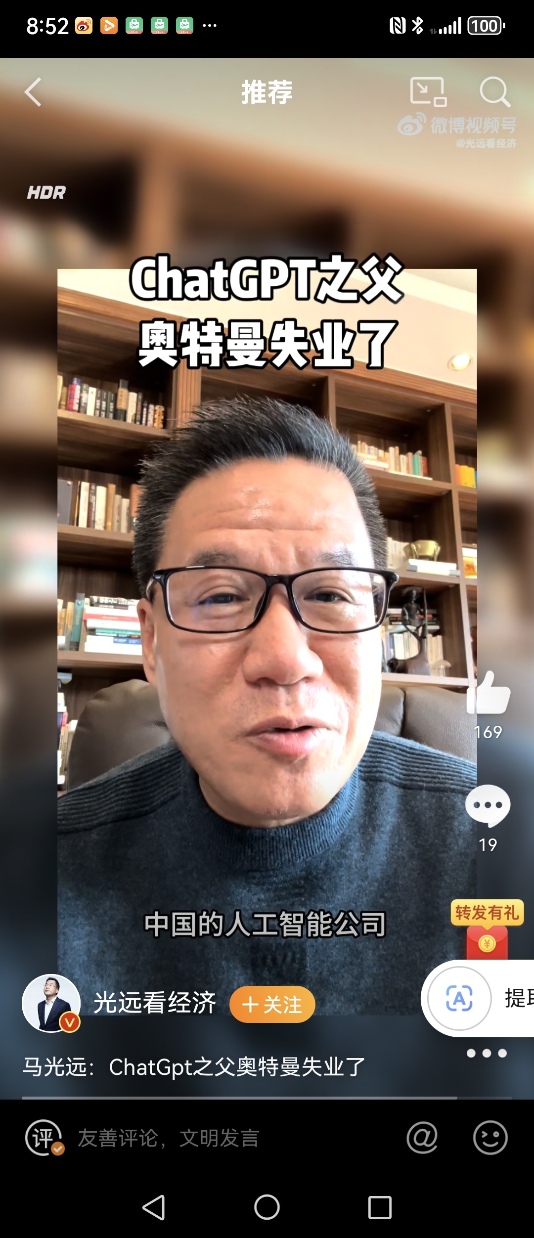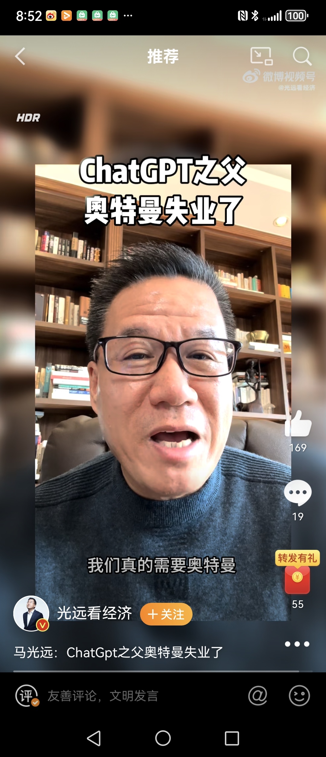 2.奥特曼被解职,用的办法非常突然,董事会处理的一点人情味没有,干掉他毫不留情,还说他不诚信。作为一个职业经理人,说明他的战略方向没有弄好,个人的诚信都有问题,这是不具有做企业领导的基本品质。美国人都忍受不了被他欺骗,中国就能忍受,或者是中国活该被骗?