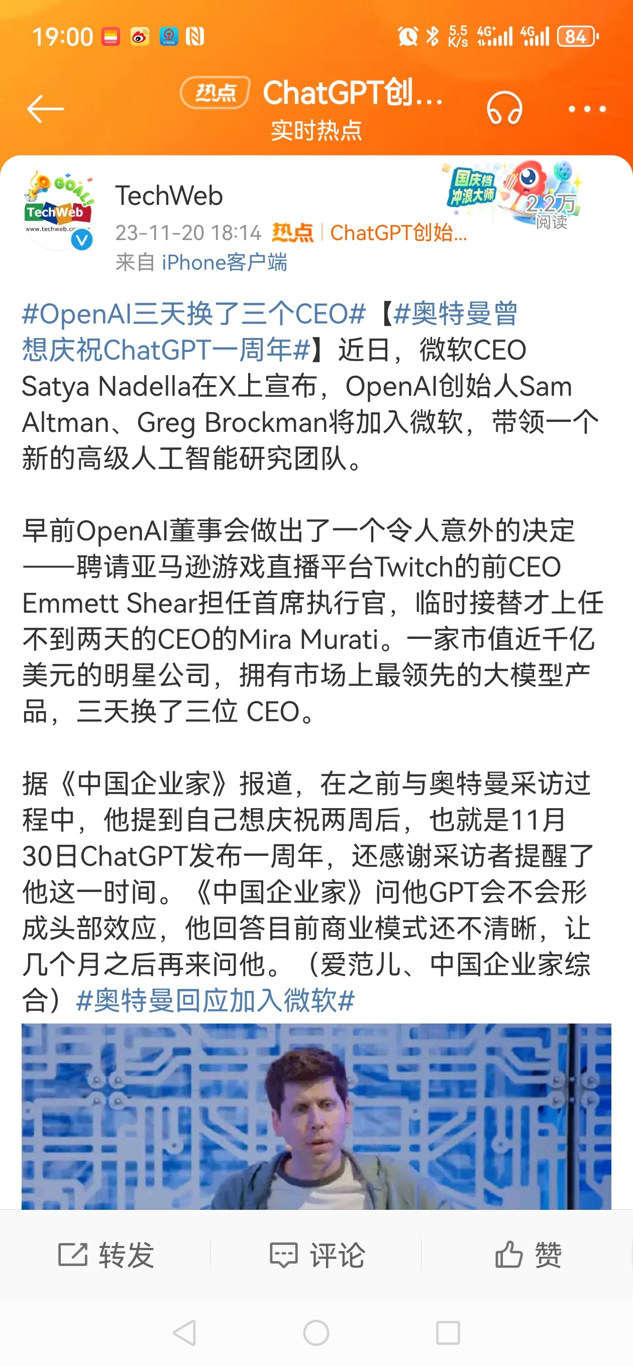4.当然一个美国企业,它爱怎么斗就怎么斗,反正和我们没有多大关系,但是某些人以为奥特曼很有才能,微软不会放弃他,这些人是没做过企业,不知道什么是企业管理,也不知道企业领导人应该干什么。