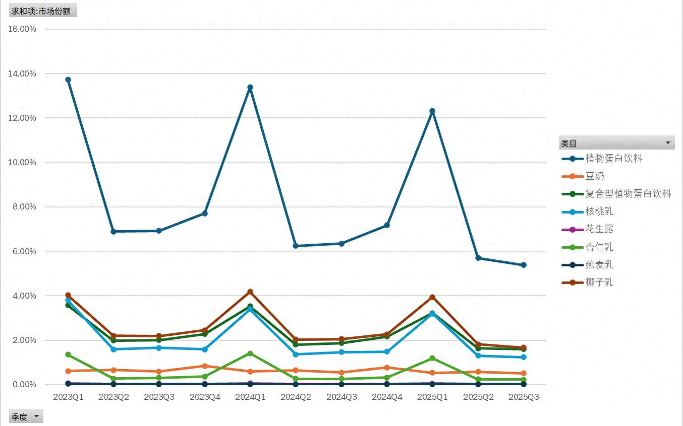 2023Q1-2025Q3植物蛋白饮料及各细分品类市场份额变化。 马上赢供图