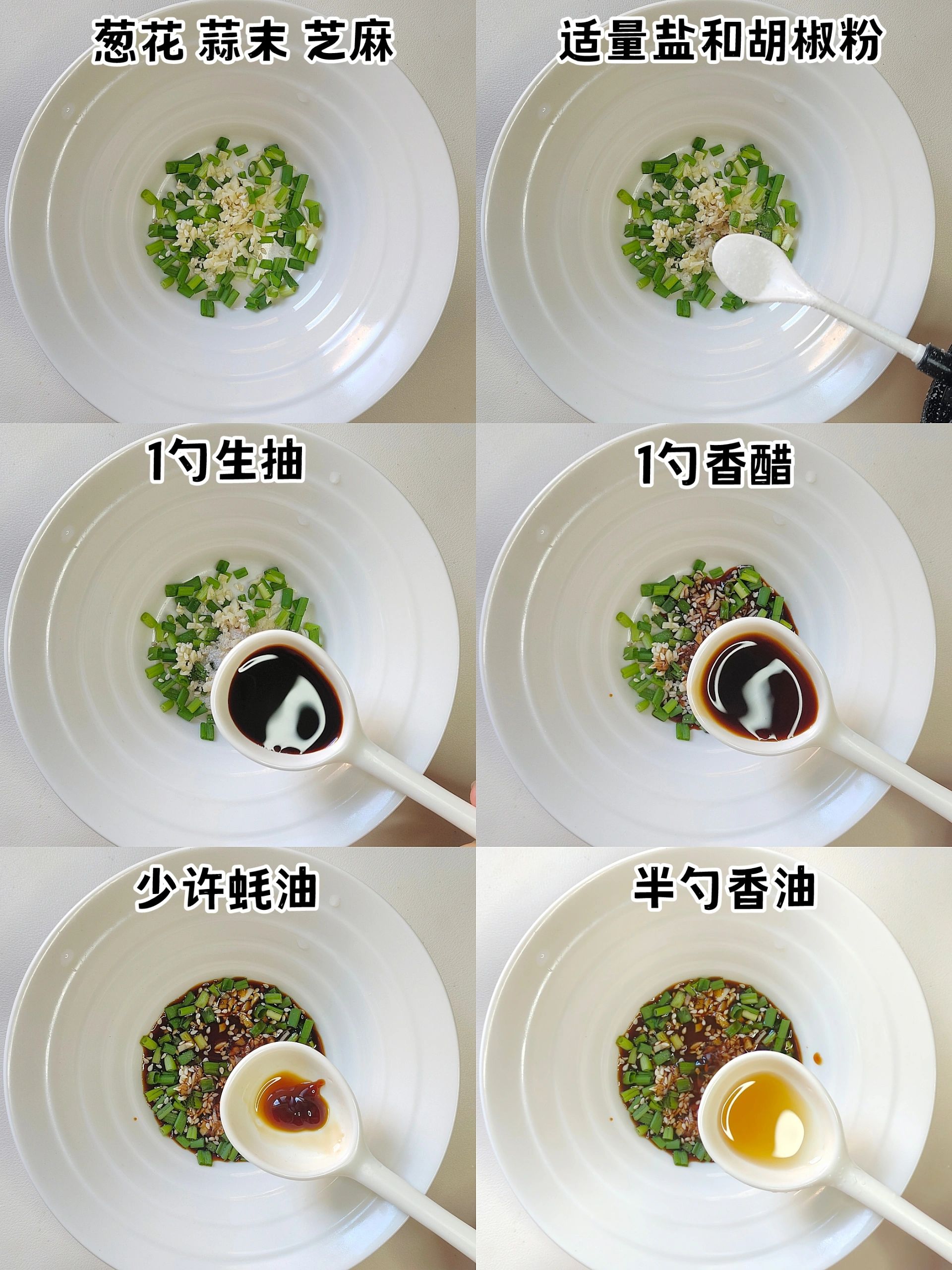 2⃣碗中放入葱花、蒜末和芝麻➕适量胡椒粉和盐➕1勺生抽➕1勺香醋➕一点蚝油➕半勺香油