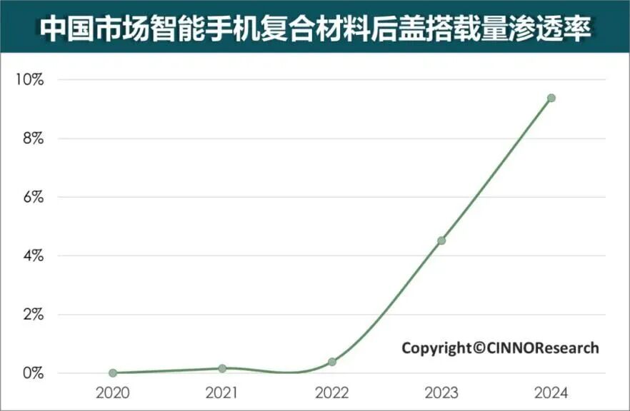 消费者愿意为设计买单,不同材质有不同的受众。据CINNO Research市场监测数据,2020年至2021年,中国智能手机复合材料后盖市场以素皮材质为主导,主要应用于高端旗舰机型。2022年,玻纤材料进入市场,2023年伴随锦纤材料的加入,素皮与玻纤后盖机型销量实现同比翻倍增长,推动复合材料后盖渗透率同比提升4个百分点。