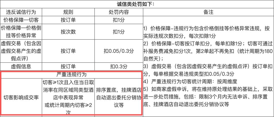 此前携程是30天统计一次,期间商家切客≥1次或入住当日取消率在同区域同类型酒店中表现异常,排序会被置底,挂牌酒店自动退出委托分销协议等;新规下携程每7天就要统计一次,期间商家切客≥1次或入住当日取消率在同区域同类型酒店中表现异常,或者切客≥2次,同样会被排序置底,挂牌酒店自动退出委托分销协议。