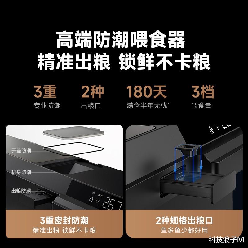 搭配全新推拉式智能防潮喂食器,采用三重防潮设计,机身、出粮口、喂食口全方位防潮,满仓可续航 180 天,同时配备双规格出粮口,能精准适配大小不同鱼种,喂食量支持三档可调,再搭配 APP 远程定时控制,即便出差加班也能安心养鱼。