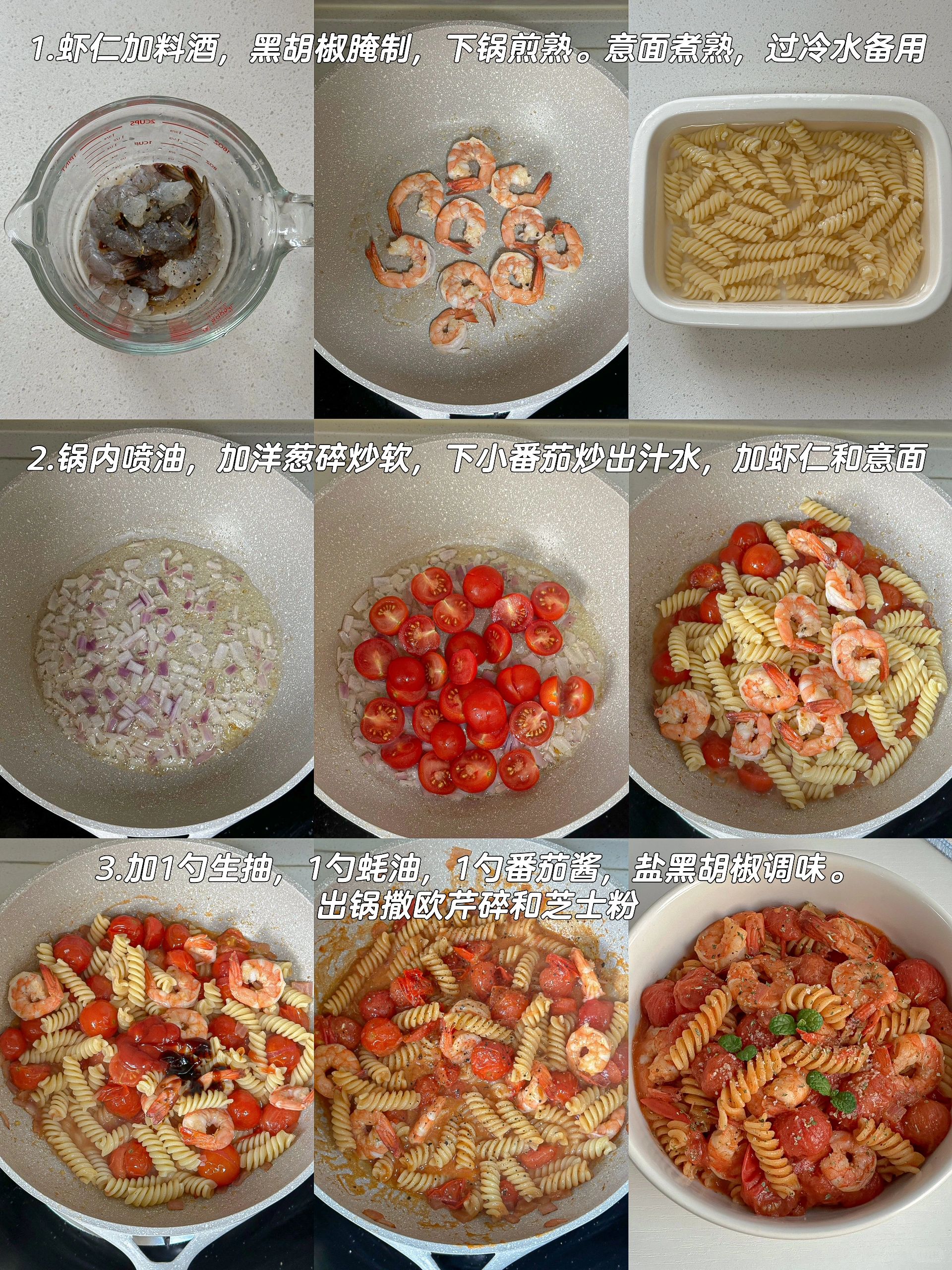2️⃣锅内喷油,加洋葱碎炒软,下小番茄炒出汁水,加入虾仁和意面