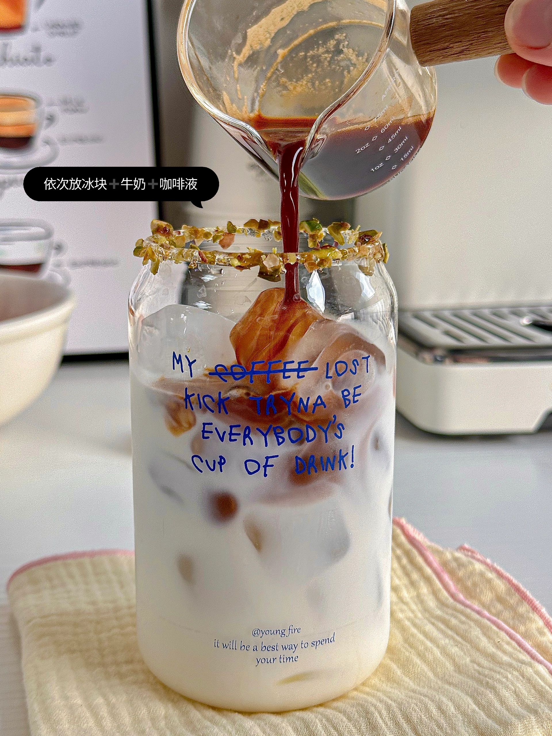 2️⃣杯子中依次放冰块,牛奶,咖啡液