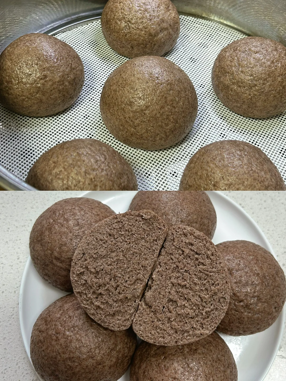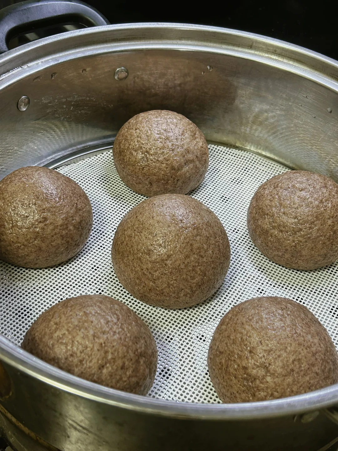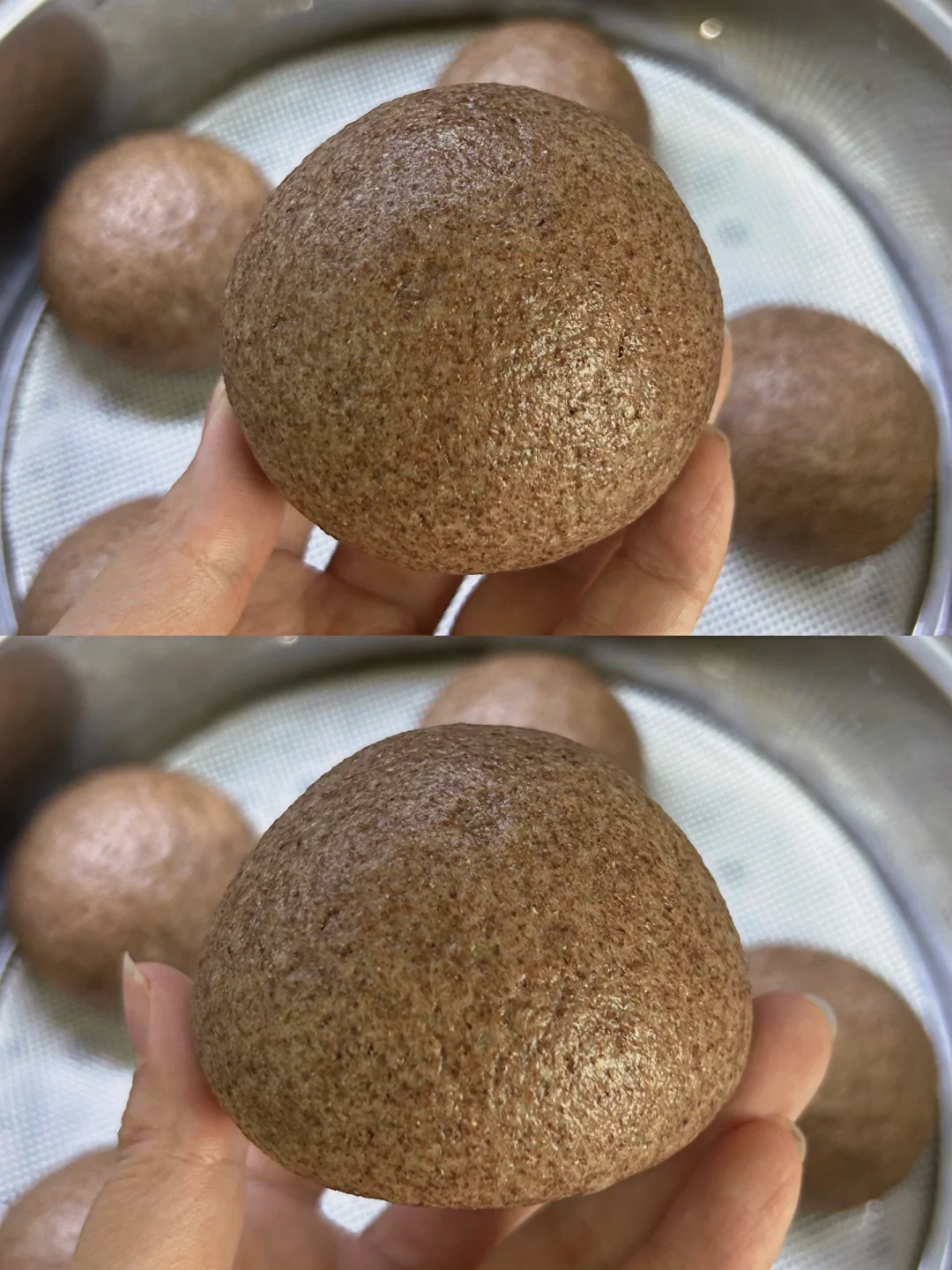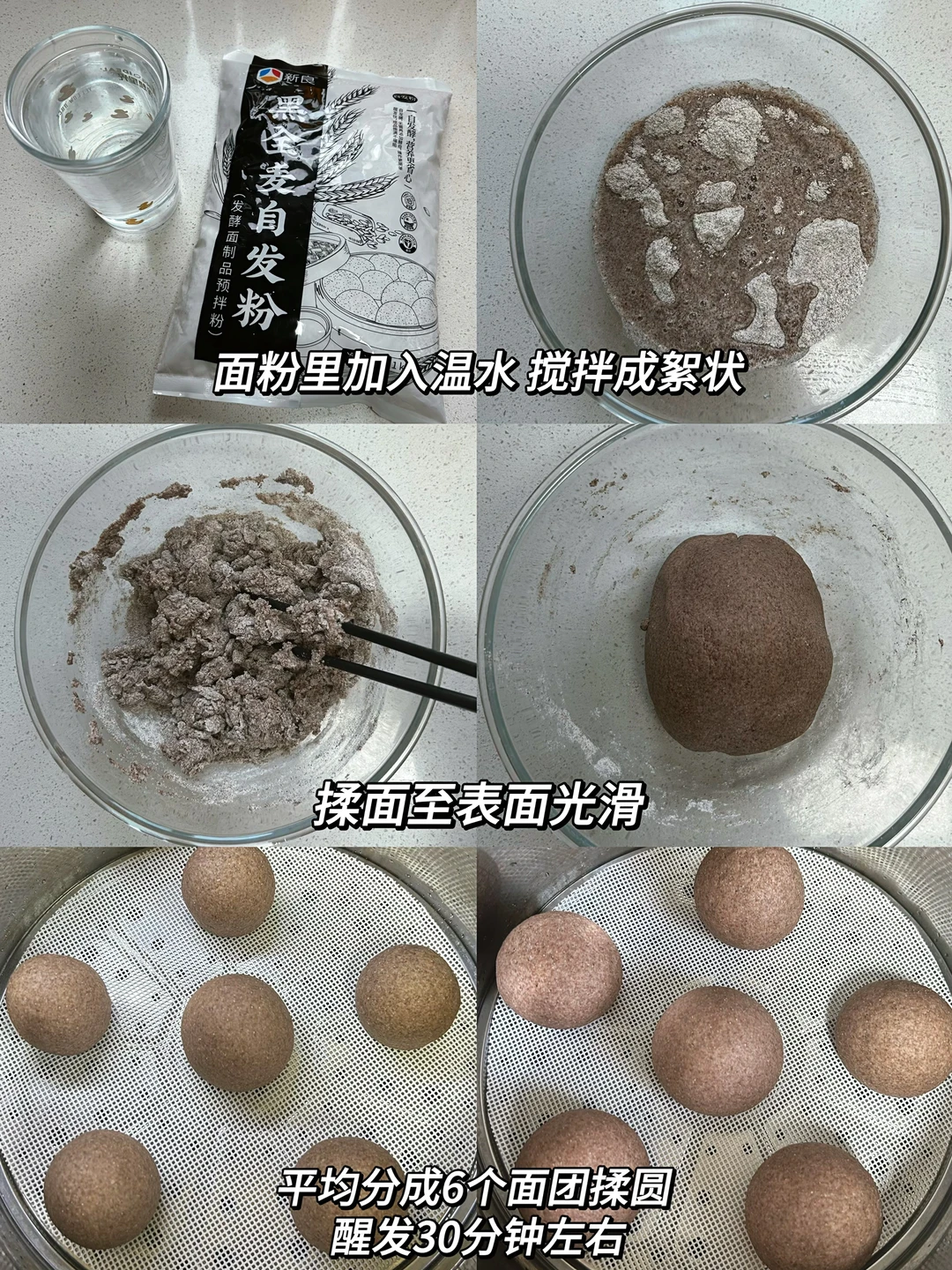第一次尝试做馒头,太成功了,关键是这个黑全麦自发粉,不需要添加酵母粉,一次发酵,巨简单。有要减肥的小伙伴一定要做,低糖高纤,饱腹感很强‼️ ✅材料: 黑全麦自发粉300克 温水170克 ✅制作步骤: 1.300克黑全麦自发粉加入170克温水,用筷子搅拌成絮状,用手揉成光滑的面团。 2.面团不用醒发,直接分成6个馒头胚,静置醒发30分钟左右,发至1.5倍大。 3.冷水上锅,水开后蒸20分钟,关火焖5分钟出锅即可。