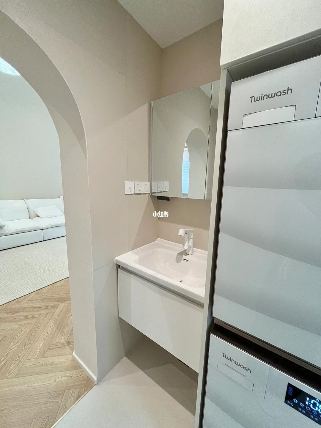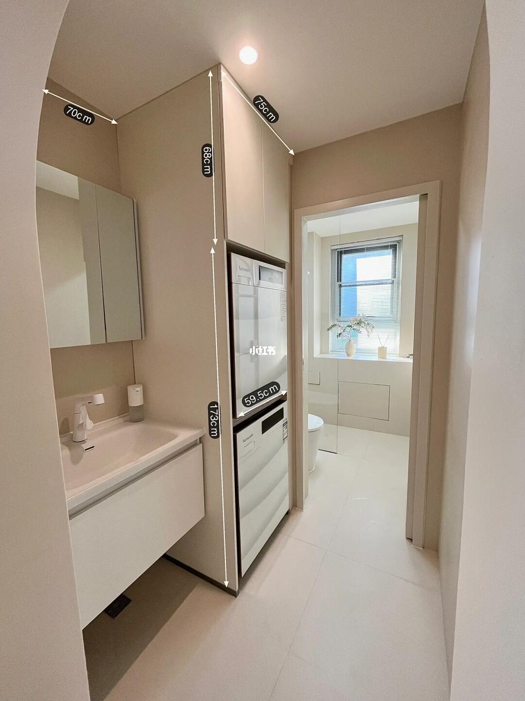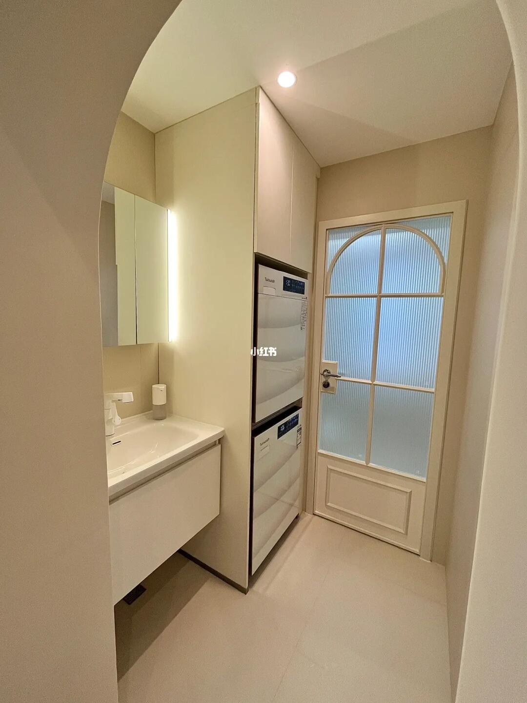干区定制了一个到顶的洗衣机柜,装下了洗衣机和烘干机,最上边一层还能收纳不少洗衣用品,旁边就是浴室柜,既能洗漱又是一个多功能的洗衣区。
