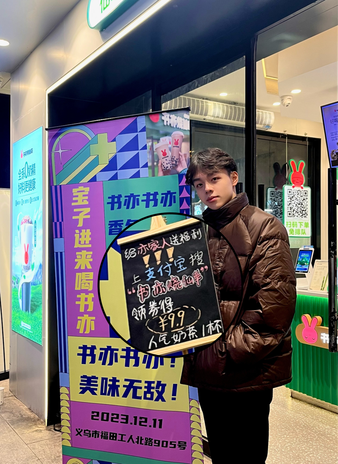 #义乌奶茶店征服老外#这揽客方式真的是既接地气又接国际啊!论会玩,还得是你们义乌!听说现在支付宝有【9.9元爆款奶茶团购券】,只要上支付宝搜索【奶茶品牌名称】,点击顶部banner页或小程序,进入优惠团门店页面,就可以在#双12抢9.9元奶茶#!券一领到手,幸福快乐我都有,谁要跟我一起去义乌喝奶茶!