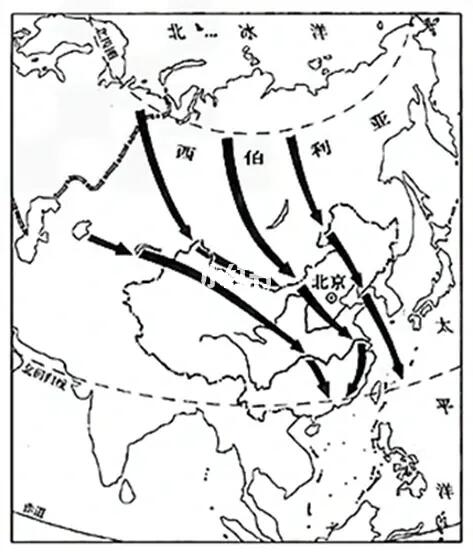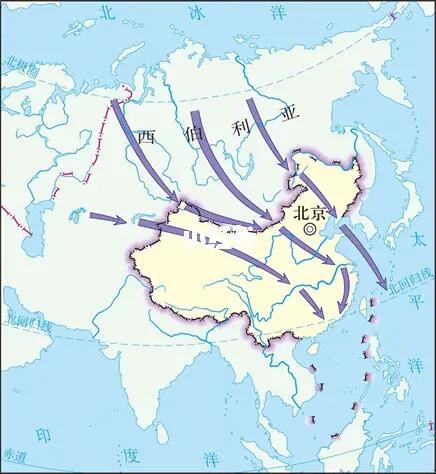 中国位于欧亚大陆的东南部。从中国往北去,就是蒙古国和俄罗斯的西伯利亚。西伯利亚是气候很冷的地方,再往北去,就到了地球最北的地区——北极了。那里比西伯利亚地区更冷,寒冷期更长。影响中国的寒潮就是从那些地方形成的。