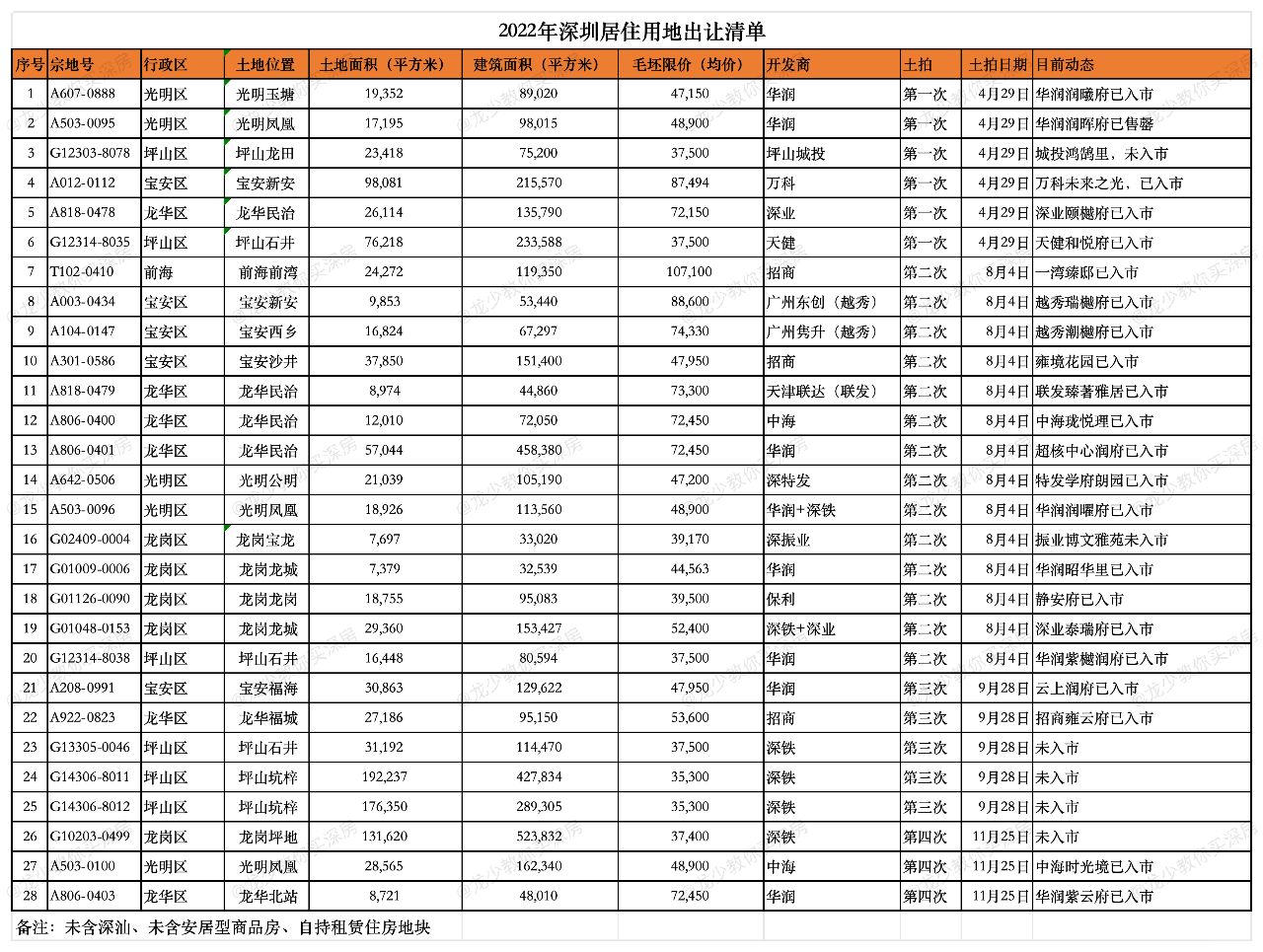 2023年宅地供应了三个批次,一批次5宗地,其中龙湖拍得的2个地块已入市销售;二批次9宗地,其中2宗地流拍、1宗地终止出让、1宗地是自持租赁住房。另5宗地建设商品房,有中海深超总、深业深高北、中铁宝中地块;三批次就2宗地,12月15日土拍结束,龙华观澜宗地不设销售限价,以底价成交。坪山宗地是自持租赁住房,由安居集团以底价竞得。