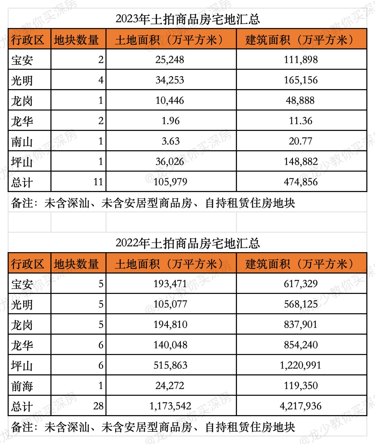 2023年深圳三次土拍地块中,除深汕、除安居型商品房、除自持租赁住房地块外,只有11宗商品房宅地,合计土地面积10.59万平,合计总建面47.48万平。对比2022年深圳四次土拍的28宗商品房宅地,合计土地面积117万平,合计总建面421万平。