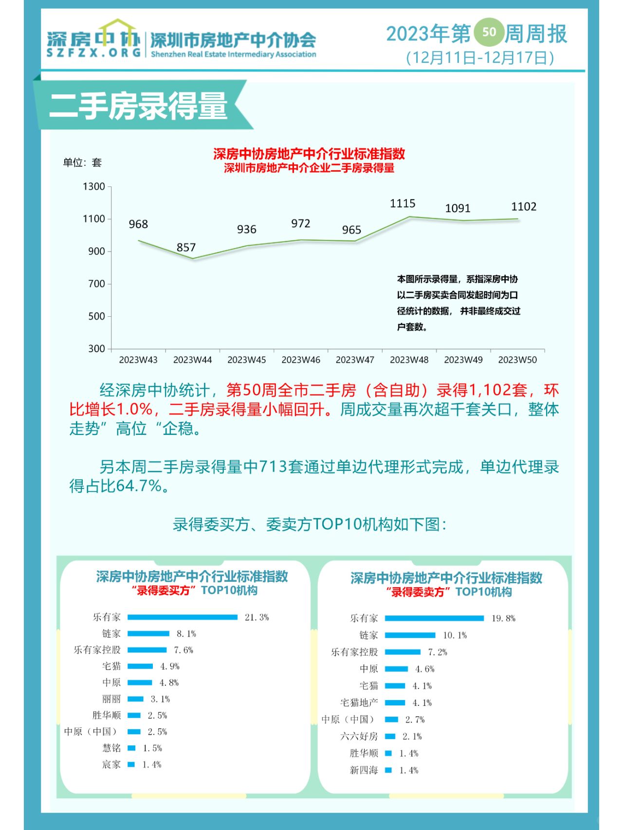 科普:录得量系指深房中协以二手房买卖合同发起时间为口径统计的数据,并非最终成交过户套数。二手房录得数相当于网签备案,最能反应当前二手房行情的数据,一般签了二手房合同后当天或第二天就会录入网签。每月深圳房地产信息系统公布的二手房网签数据实际是二手房过户数据,一般都会比录入网签滞后1个月左右。要了解深圳二手房当前市场情况,看深房中协每周公布的二手房录得数据最有参考价值。