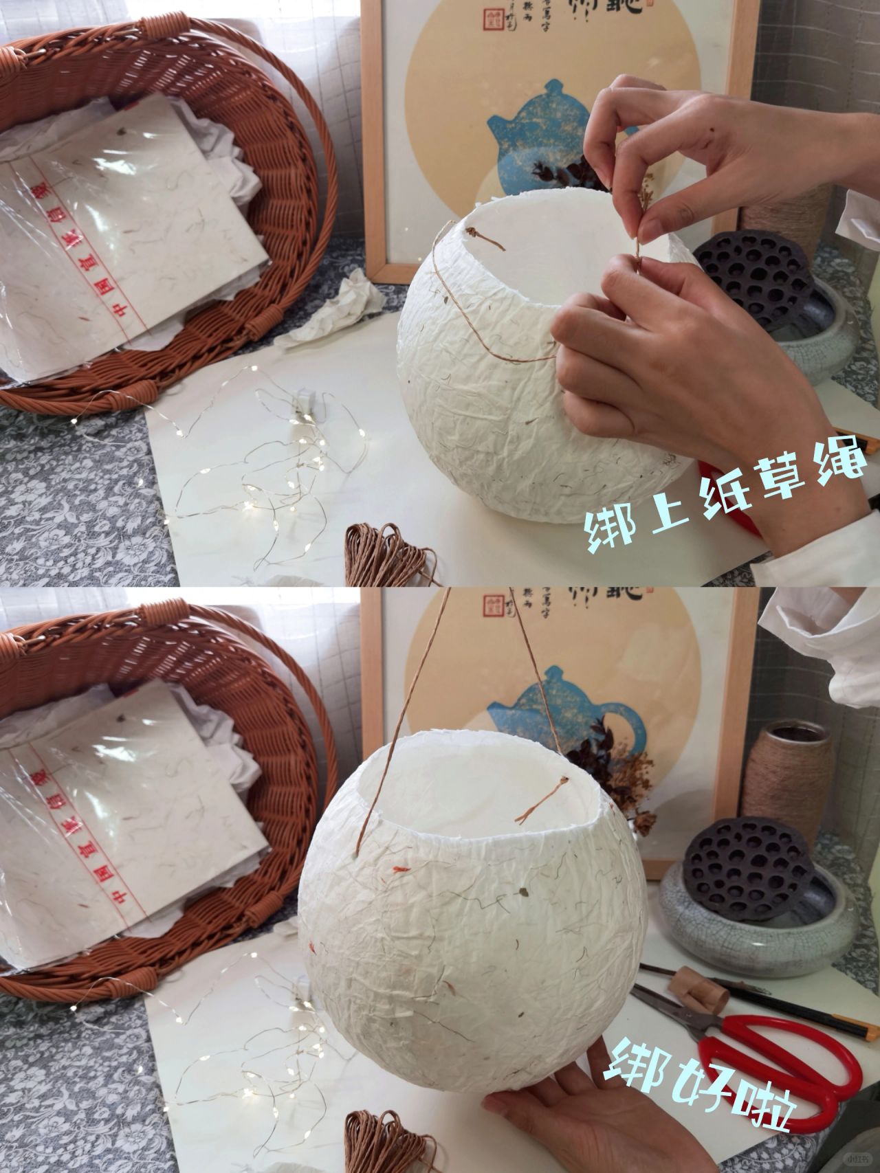 📝步骤 1⃣将气球吹到合适大小 2⃣在气球上用水刷上一层纸巾 3⃣水和白胶按2:1的比例混合,搅拌均匀 4⃣调好的胶水,刷5层纸巾 5⃣刷上花草纸 6⃣把气球倒置过来,放置到干透,(表面摸起来硬硬的,听到纸和气球分离的声音) 7⃣气球放气,修边,对称打上两个孔,装上纸草绳 8⃣放入灯珠,就完成啦