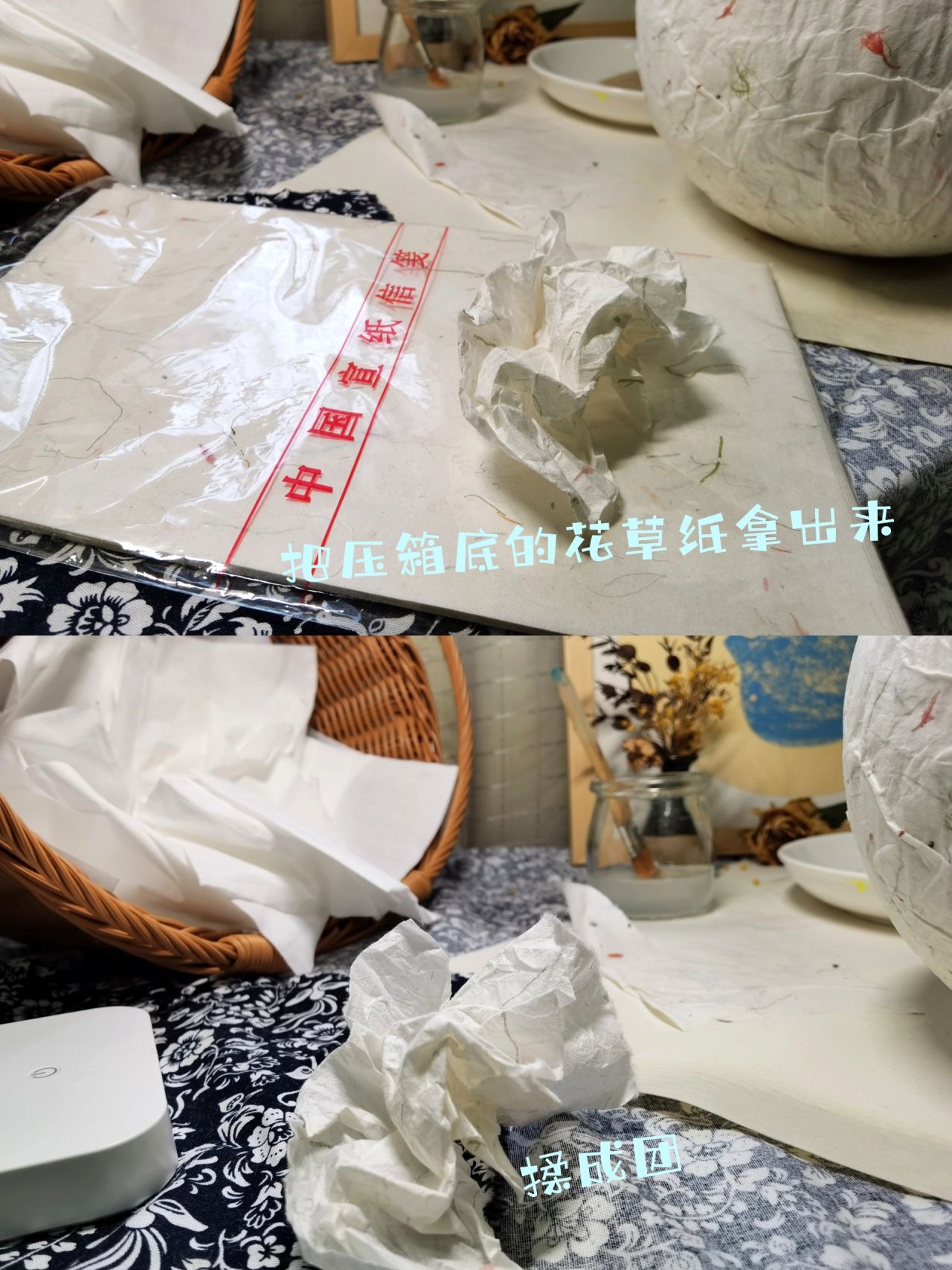 自然美育|和孩子们一起来DIY中秋花灯吧 #浪漫生活的记录者 虎宝撕下的纸巾,收集了起来,离中秋节不远啦,和小朋友们一起做了个花草灯。 材料 1⃣花草纸(宣纸) 2⃣剪刀、白胶 3⃣气球 4⃣纸巾 5⃣小灯珠、纸草绳