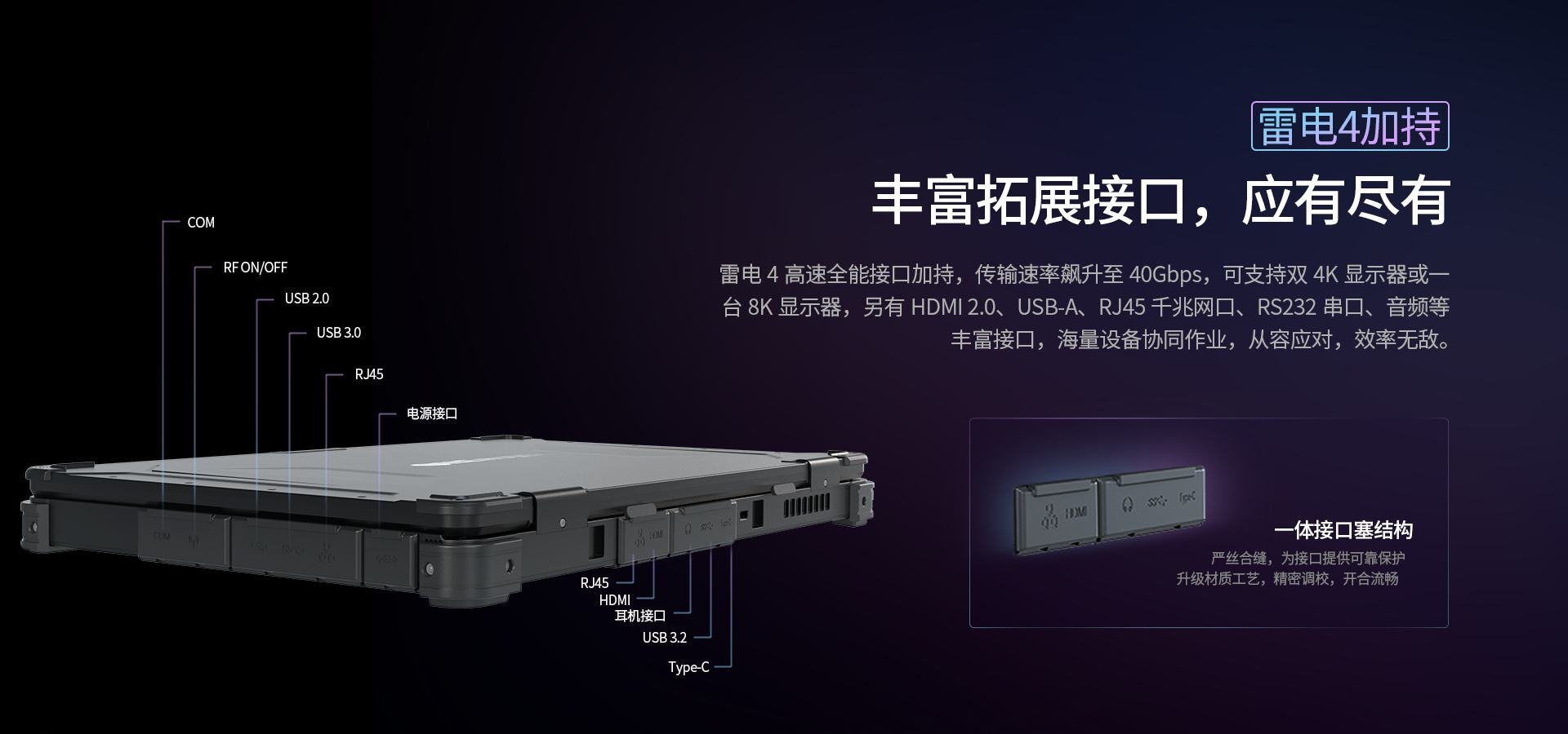 丰富接口与无线配置进一步拓展加固笔记本电脑的场景适配能力。设备搭载雷电 4 高速接口,搭配HDMI、USB、RJ45 千兆网口、RS232 串口等丰富端口,可同时连接外设、显示器、工业设备等,满足多设备协同作业需要。支持 Wi‑Fi 6、蓝牙 5.1,可选 4G/5G 全网通模块,网络连接稳定,数据实时传输无压力,配合位置追踪,适配野外勘探、物流调度、应急指挥等场景。同时配备指纹识别、物理摄像头防窥、RF 快捷开关等安全设计,守护设备与数据安全。