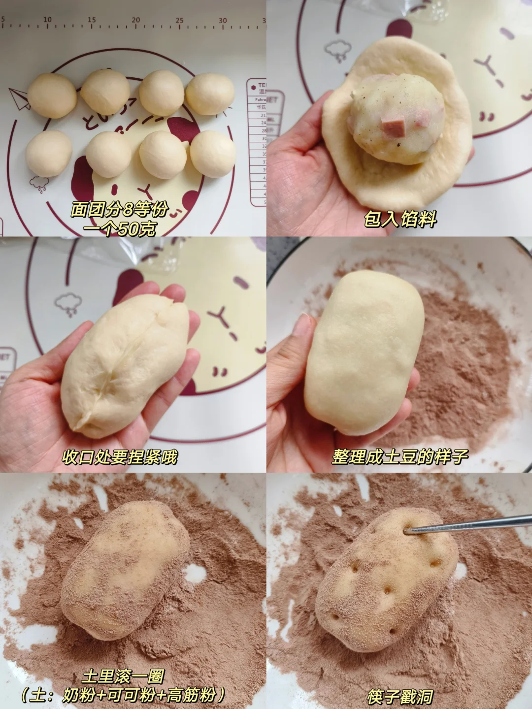 [三R]面团分8等份,每份50克,包入馅料,如图整理成土豆样子,土里滚一圈,筷子戳洞。