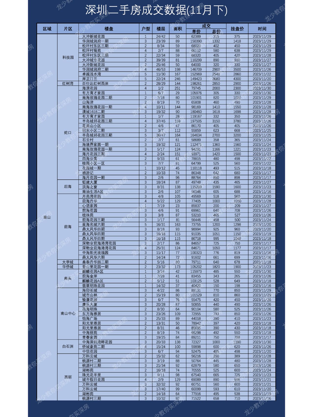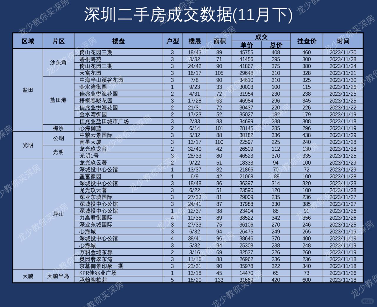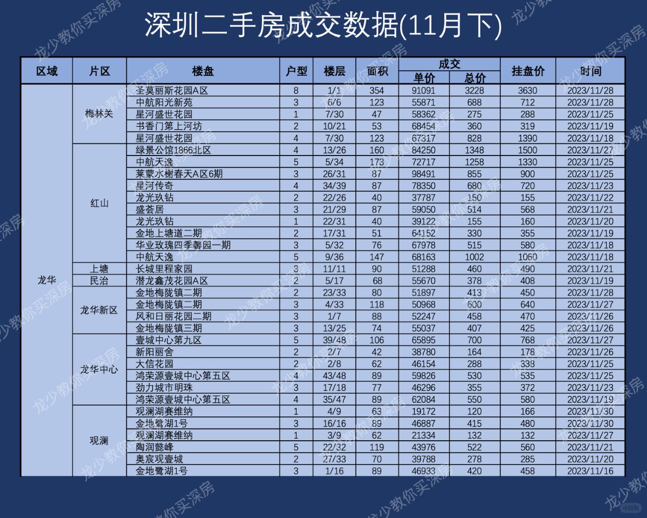 深圳各区11月下半月二手房实际成交单价、总价和挂盘价对比! 给有需要的童鞋!