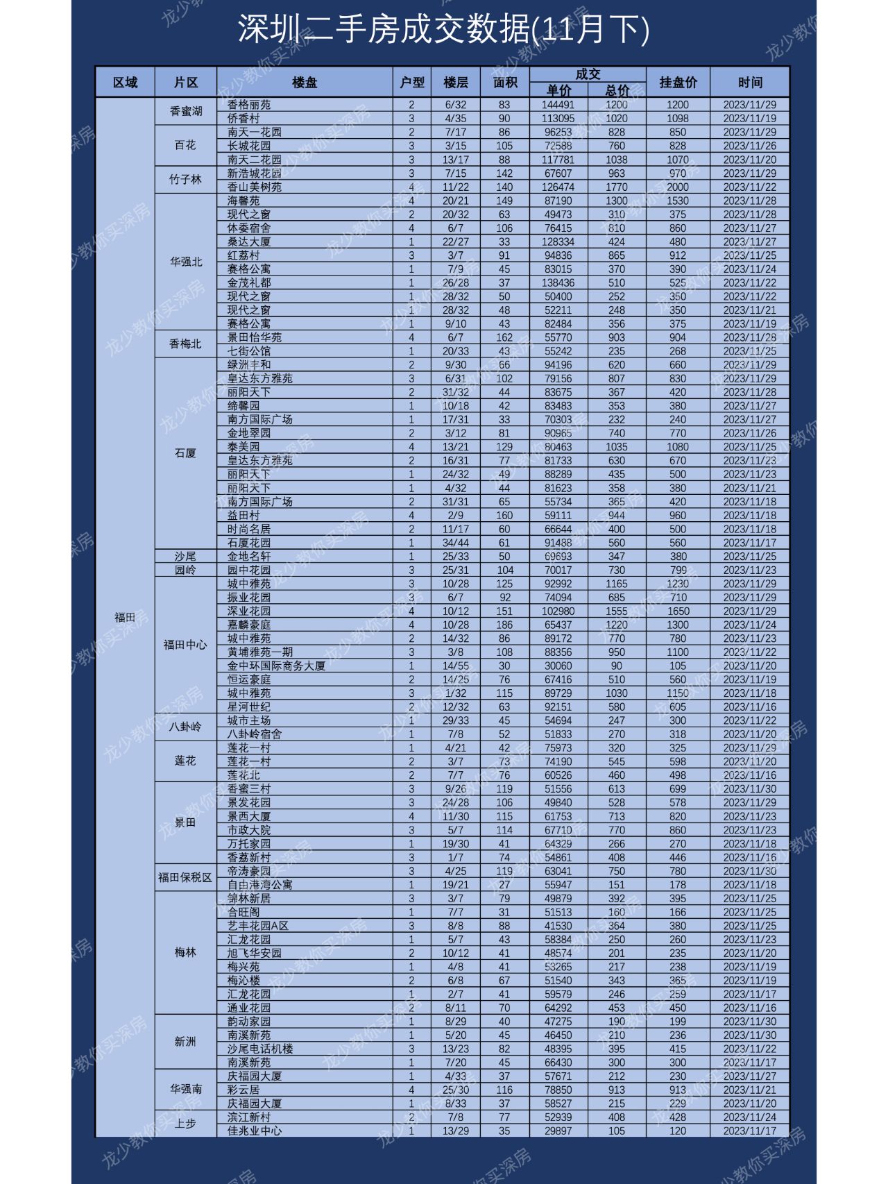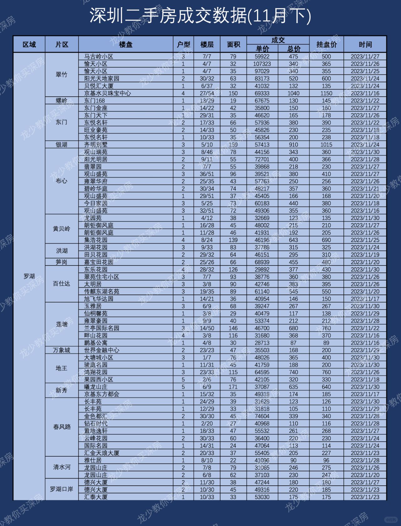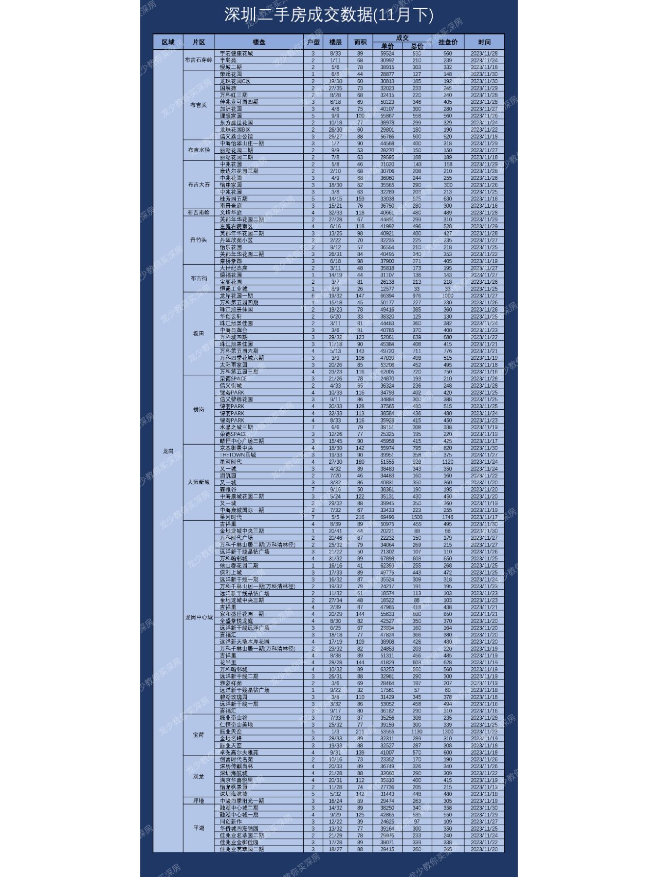 深圳各区11月下半月二手房实际成交单价、总价和挂盘价对比! 给有需要的童鞋!