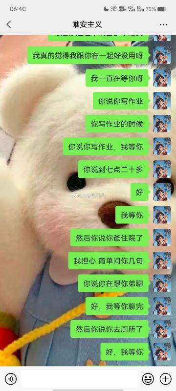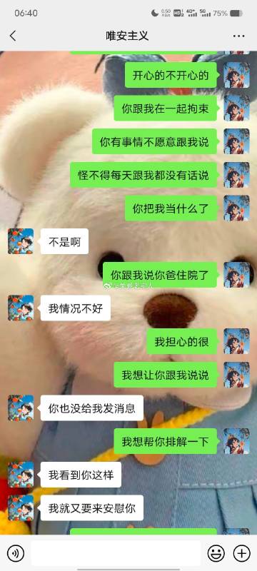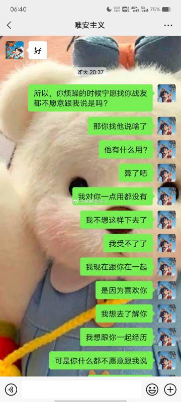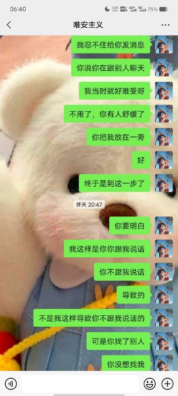 跟男朋友总吵架,像个疯子,我是一个情绪及其不稳定的人,特别爱生气。跟男朋友在一起将近五年,刚开始我没那么喜欢他的时候,不怎么生气,后来他对我很好,我越来越爱他,但是确变得越来越敏感多疑,自己都觉得像个神经病。他最近这半年明显烦了,不愿意哄了。冷静时我总能理解他,也知道是我不对。但是不知道为啥吵架的时候就像是一个情绪失控的疯子。我知道是自己的问题就是当时控制不住,每次吵架到凌晨把自己气的半死,失眠焦虑气一身病。因为我把他看做了我的全部,所以每次下定决心要分手都分不掉,我也确定他还爱我,他还是对我很好,但就是我的脾气,和我的性格在作怪。我不知道该怎么控制。图片是昨晚刚吵架,现在基本是三天一小吵五天一大吵。我还是想做点努力,不想分开。我也不知道自己想说什么在说什么,总之就是我该怎么做一个情绪稳定一点的人呀。