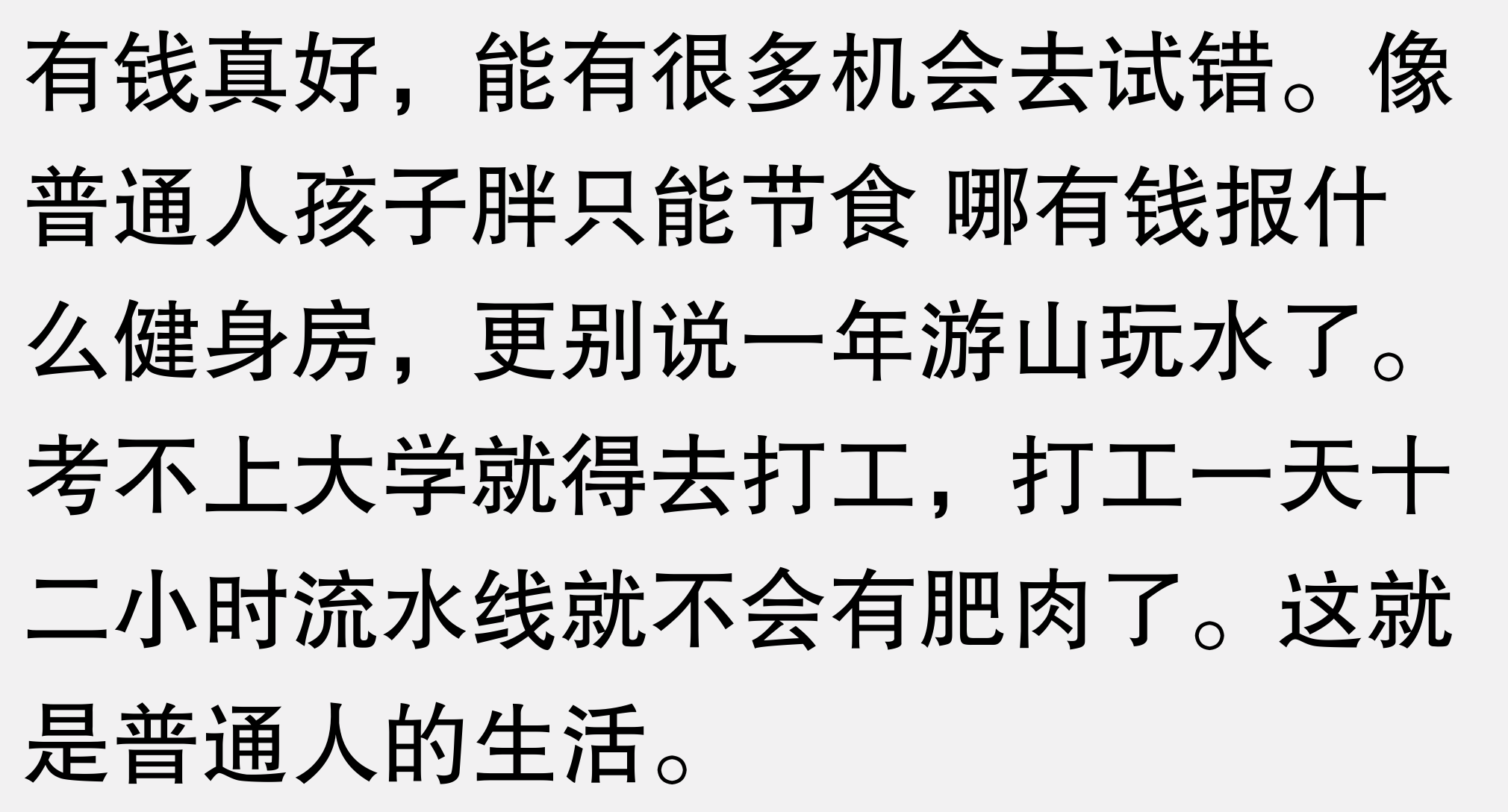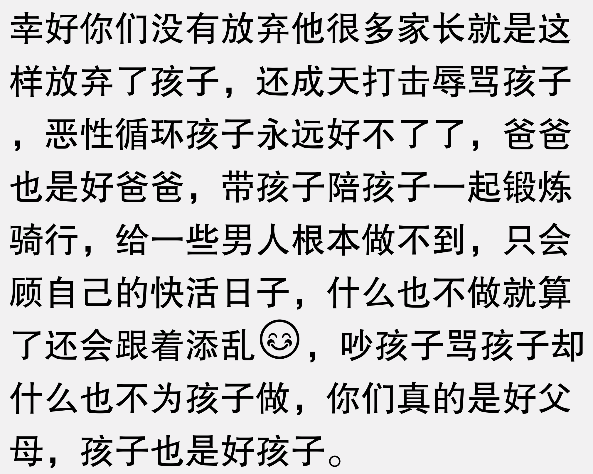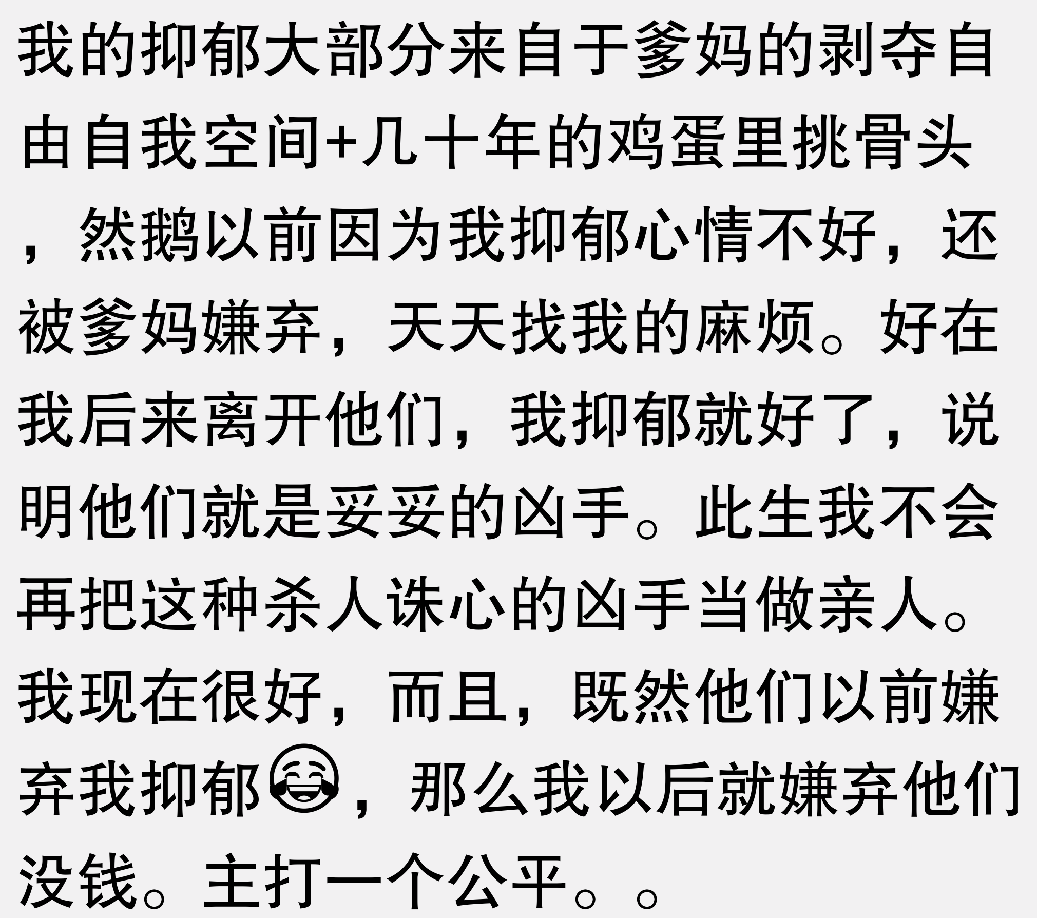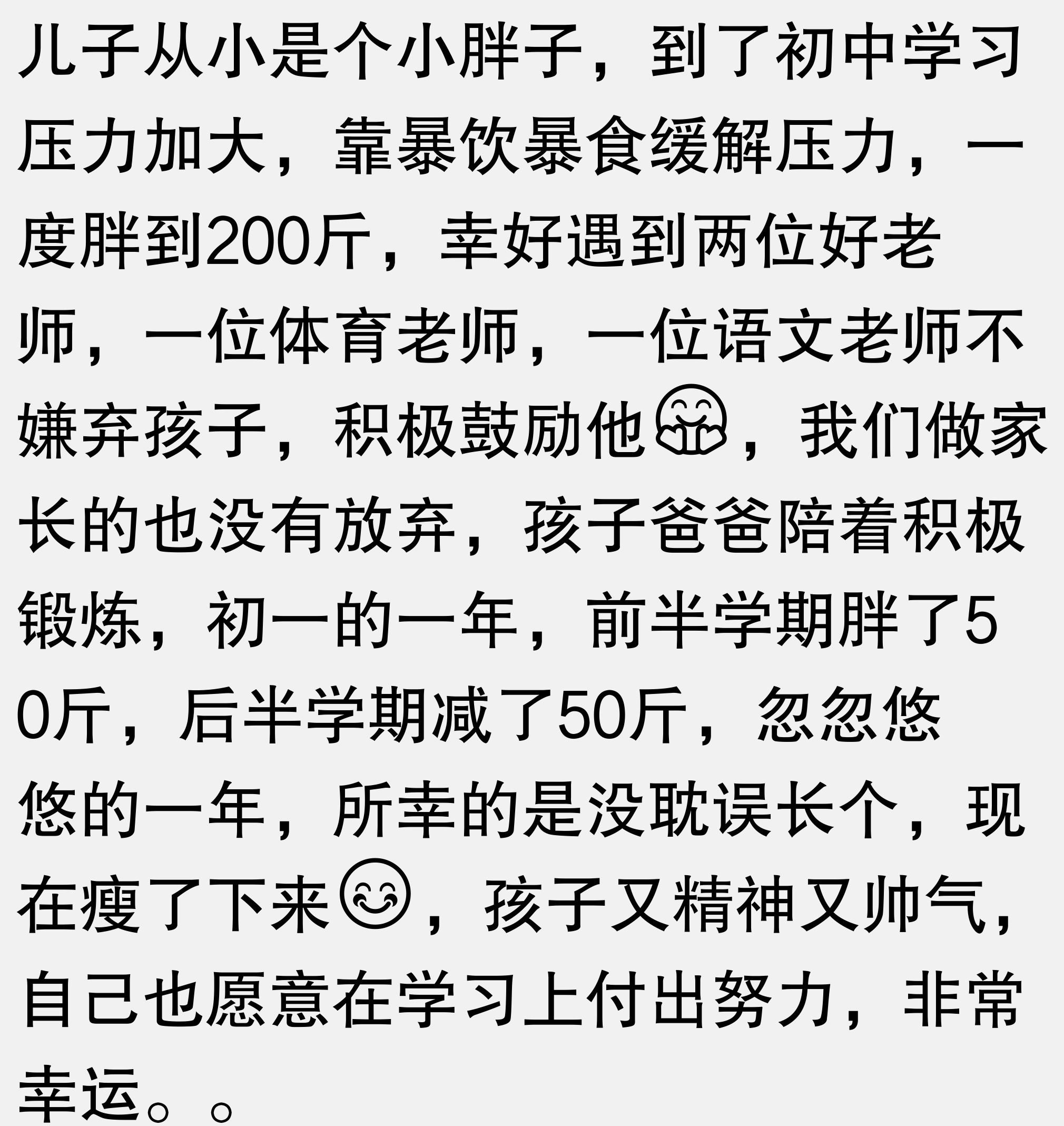 你们家庭真好,我是被爸妈各种打压抑郁的,当时高考完的暑假也是那样疯狂吃吃到180多斤,我很清楚我当时绝对抑郁了,可是父母根本不理解。后面自己在大学看开了才减了50斤,然而原生家庭的逆天让我很难一步一步有下去,你们还有钱给儿子整牙,而我是过年收个压岁钱还被父亲骂窝囊废的人,妈妈已经不给我生活费了说要自己留着旅游,现在的我在准备考研了,我只知道孤注一掷,我以后只能远离他们了,没有办法