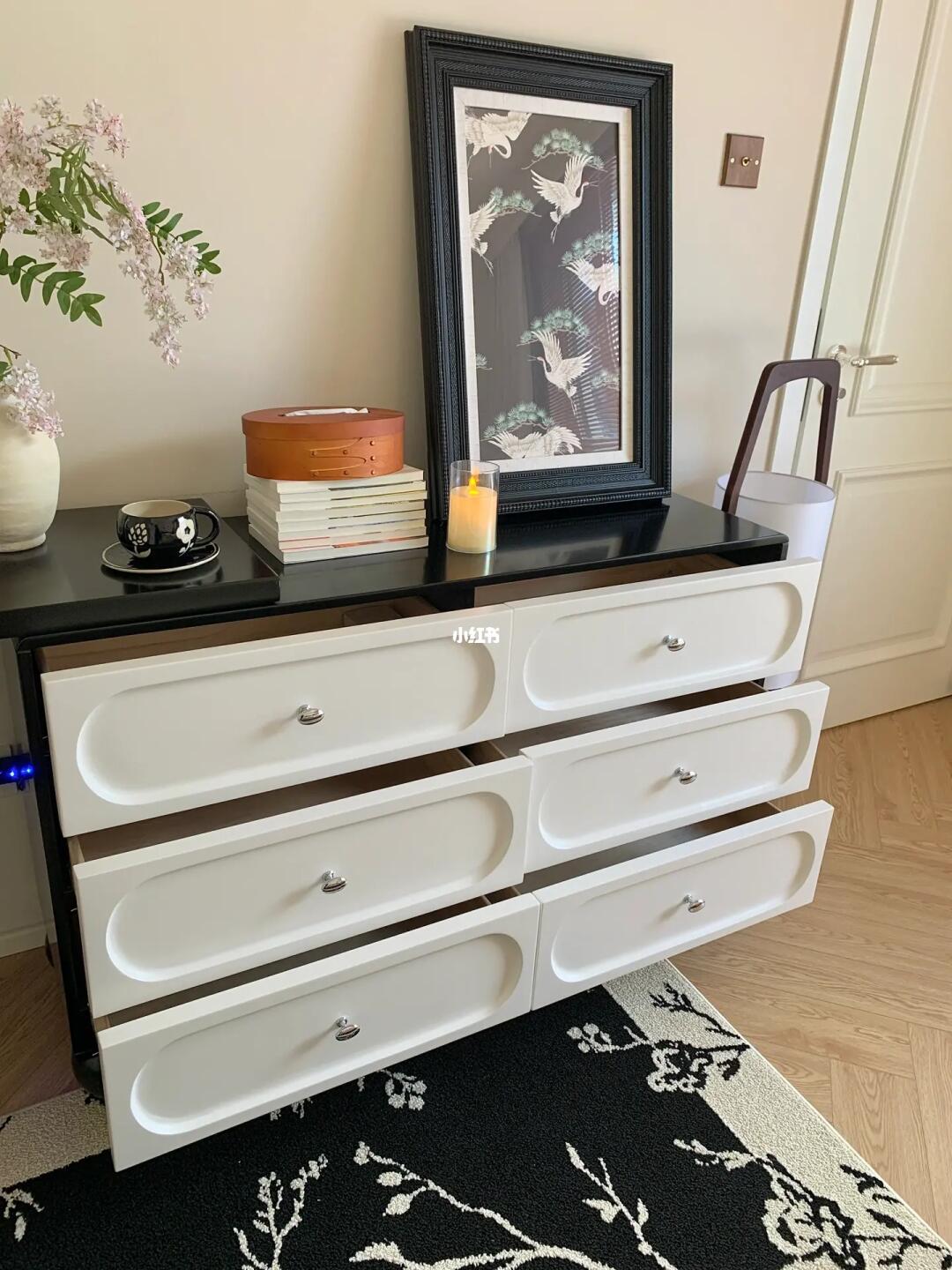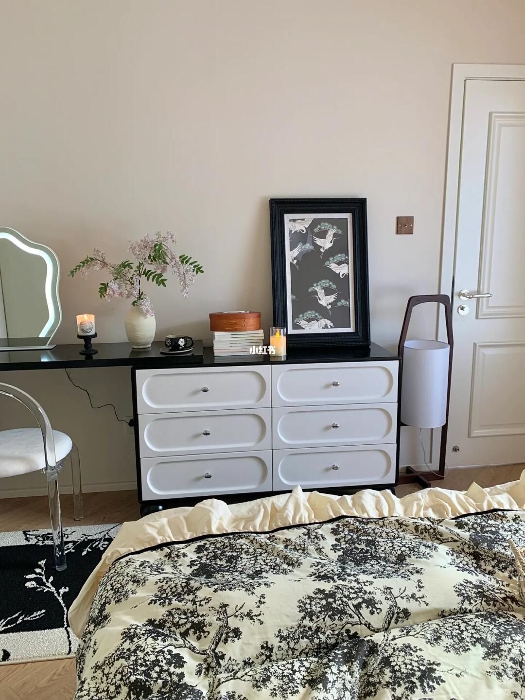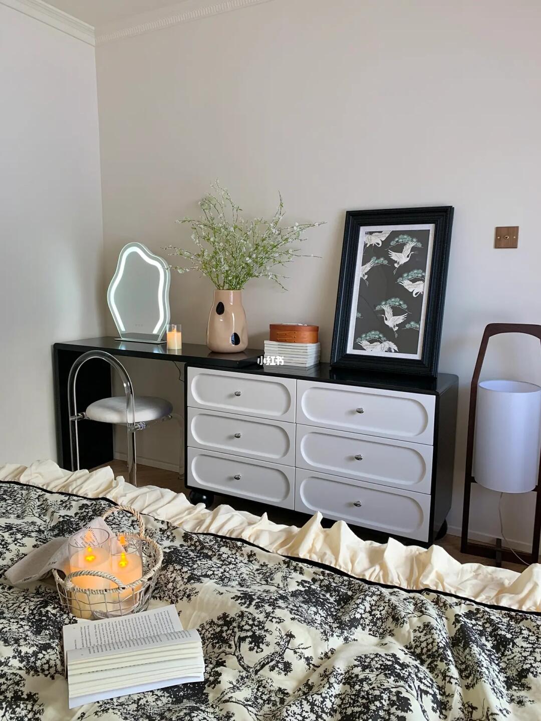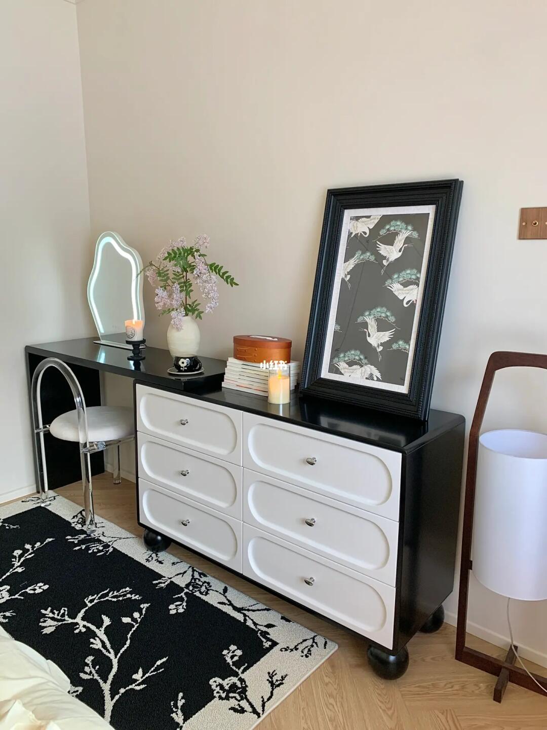 卧室面积12平方,做了一门到顶的柜子 又放了1.8米的大床 床尾空间所剩无几 想要收纳空间又想要符合中古风的高级感 终于找到了这款梦中情柜~ . 黑色系的斗柜梳妆台呼应了房间的色调 柜子是黑白撞色的,自带高级感 六个抽屉自带防撞缓冲功能,收纳空间很足 深度只有40厘米,很适合小卧室 实木烤漆的材质,用起来质感也不错~ . 跟我一样卧室空间小的姐妹可以冲哦~