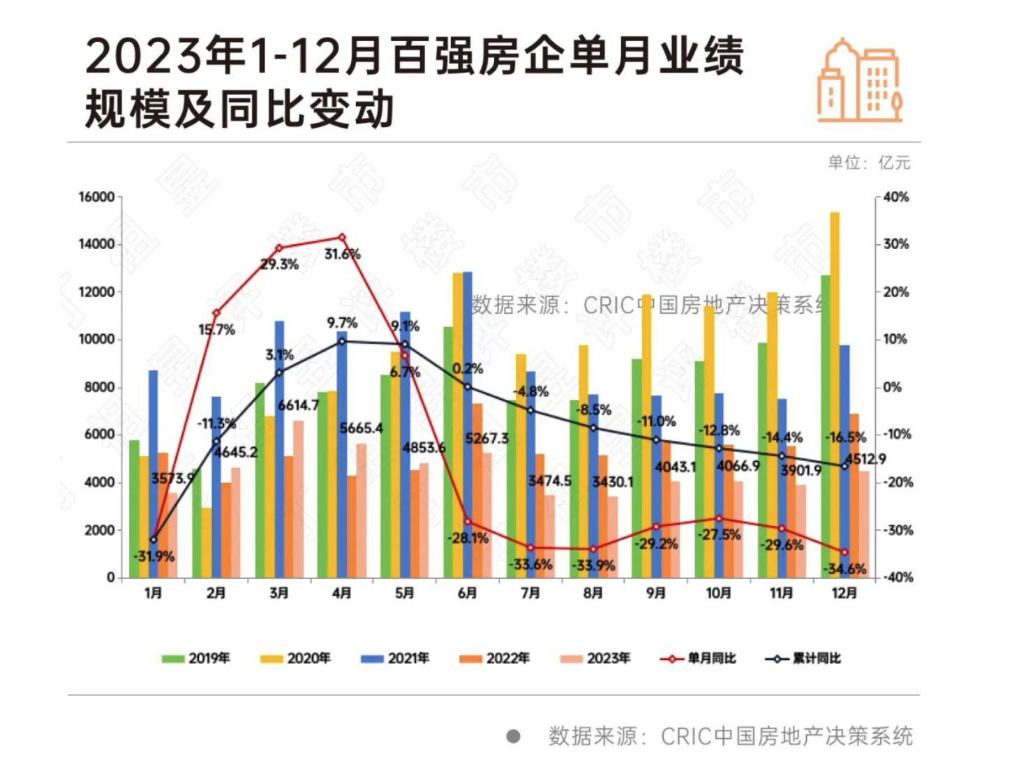 2023年12月,TOP100房企实现销售操盘金额4512.9亿元,环比增长15.7%,增幅低于往年同期;同比降低34.6%,同比降幅保持在年内高位。累计业绩来看,百强房企1-12月实现销售操盘金额54049.5亿元,同比降低16.5%,累计业绩降幅继续扩大。