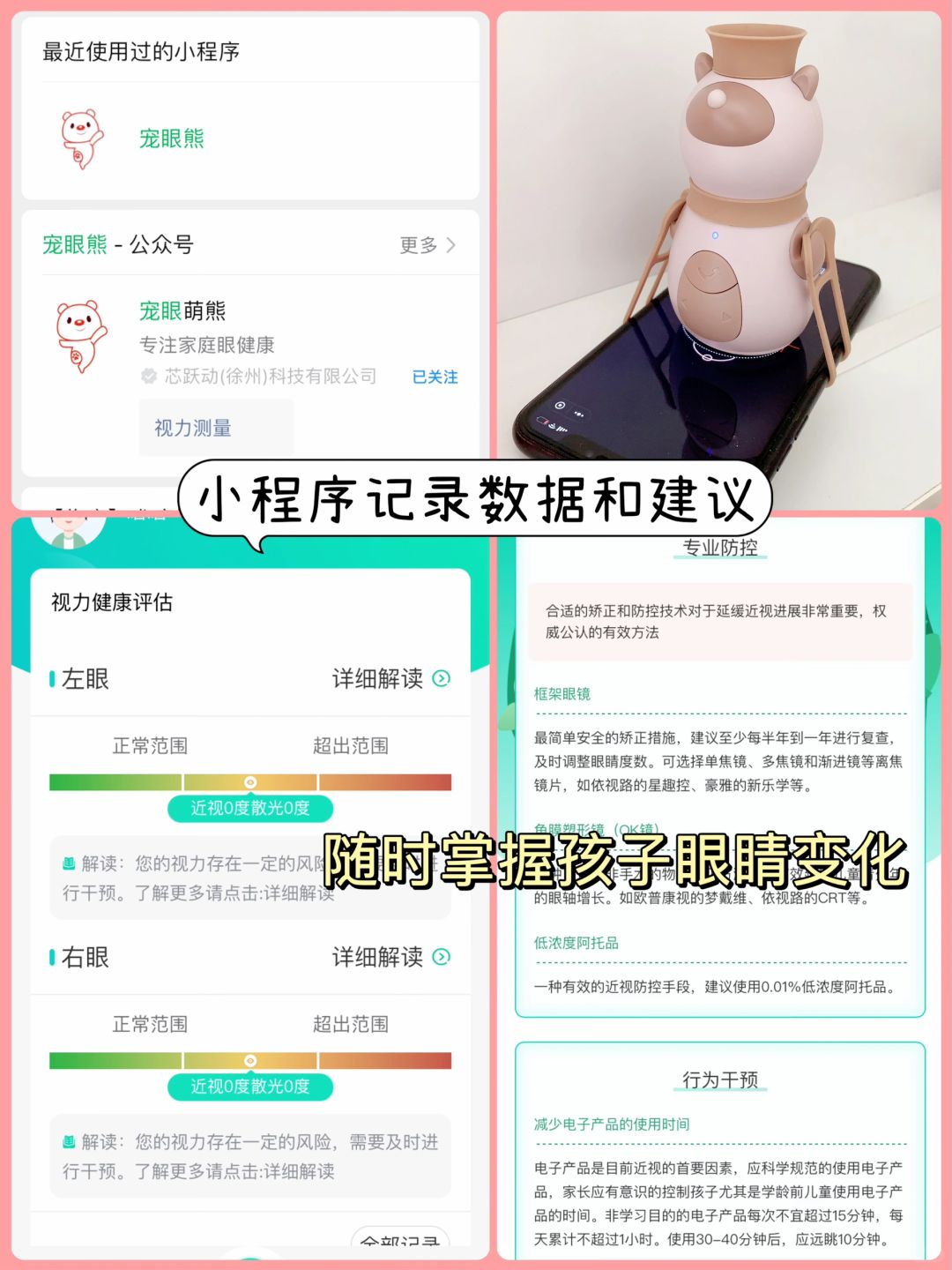 它可以在家里做视力测试,和“宠眼熊”小程序配套使用。每次给嘻嘻测视力,数据会记录到这个小程序里,然后生成检测报告和评估建议。有任何的数据波动都能毫不费力地发现。