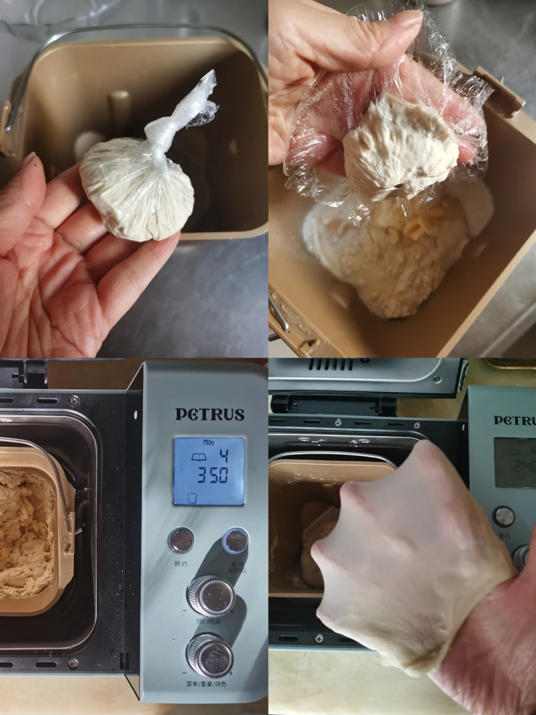 2. 避免酵母提前发酵,在最后一次揉面前加入酵母,柏翠面包机的“和风面包”程序在液晶显示2:45的是时候放入。