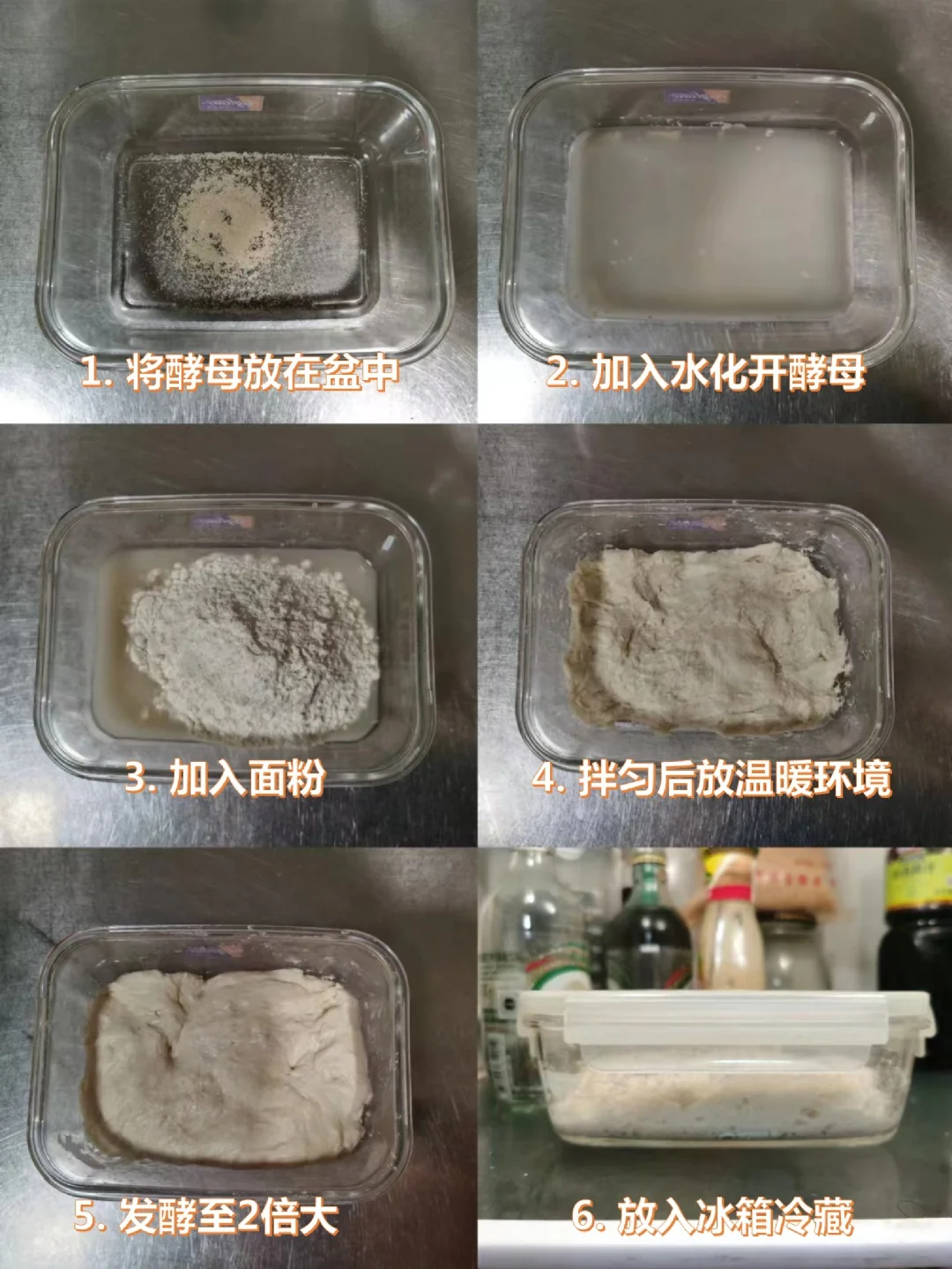 3. 将面团送入冰箱冷藏,隔夜就可以使用,面团内部呈蜂窝状。
