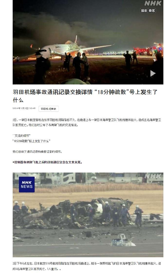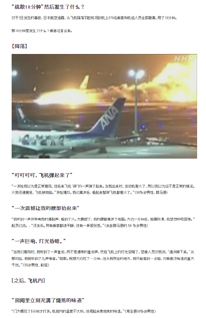 客机很侥幸了,十几人受伤,没有人死亡,原因很简单,这客机是降落状态,携带的燃油已经是安全范围内,虽然相撞造成了失火,飞机也燃烧了,但是发展的较慢,可以让飞机上乘客用18分钟才撤离。如果也是带了大量的燃油,几分钟就烧起来,这飞机上死一半人也未可知,没有死人,就是侥幸,和日本的素质没有一点关系。