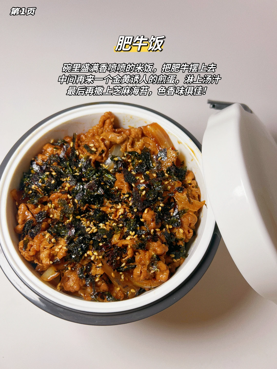 碗里盛满香喷喷的米饭,把肥牛摆上去,中间再来一个金黄诱人的煎蛋,淋上汤汁,最后再撒上芝麻海苔,色香味俱佳!