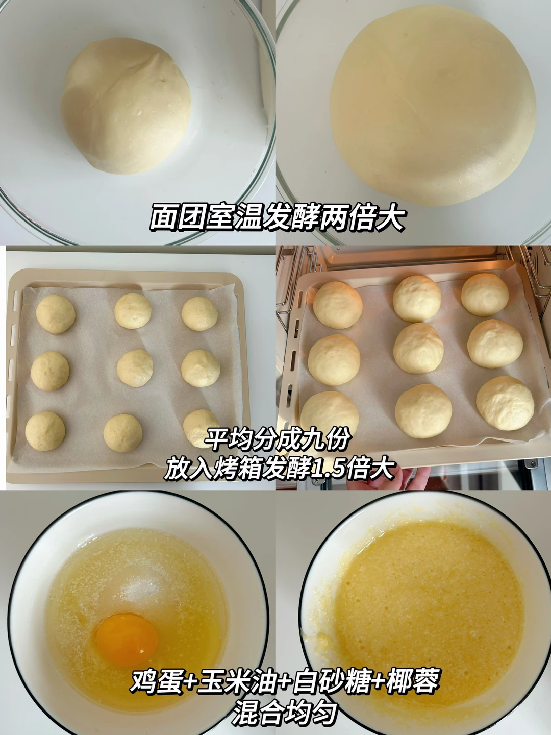 4️⃣醒发的同时开始制作椰蓉酱,一次性加入鸡蛋、玉米油、白砂糖、椰蓉混合均匀,装去裱花袋挤在醒发好的面团上。
