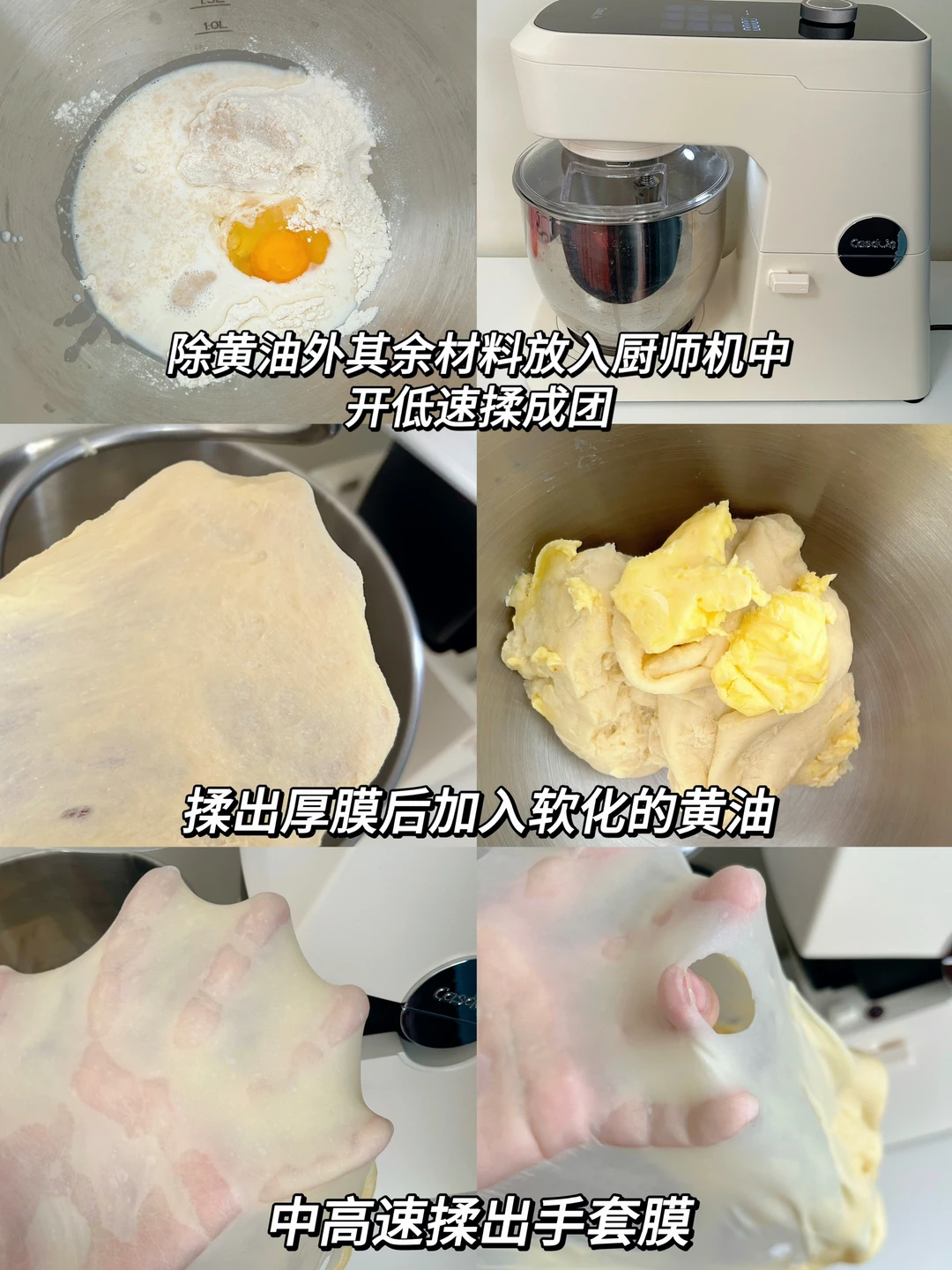 1️⃣除黄油外其他材料全部放入凯度F7厨师机中,先开低速混合均匀,揉出粗膜后加入软化好的黄油,再转中高速揉出手套膜。