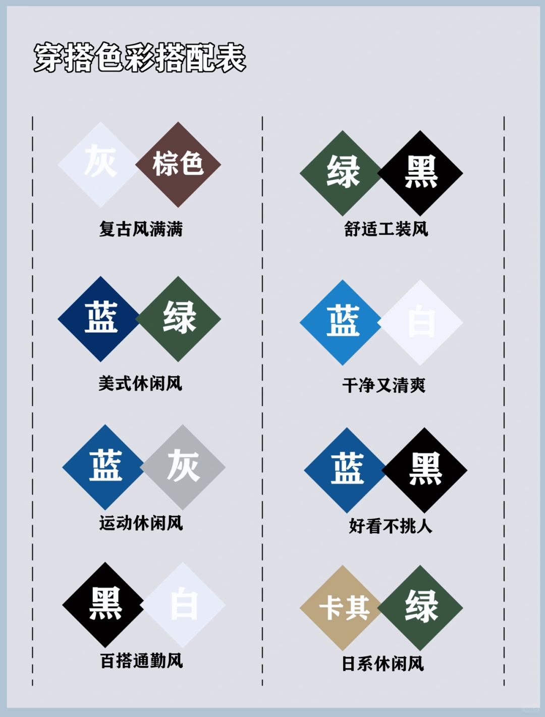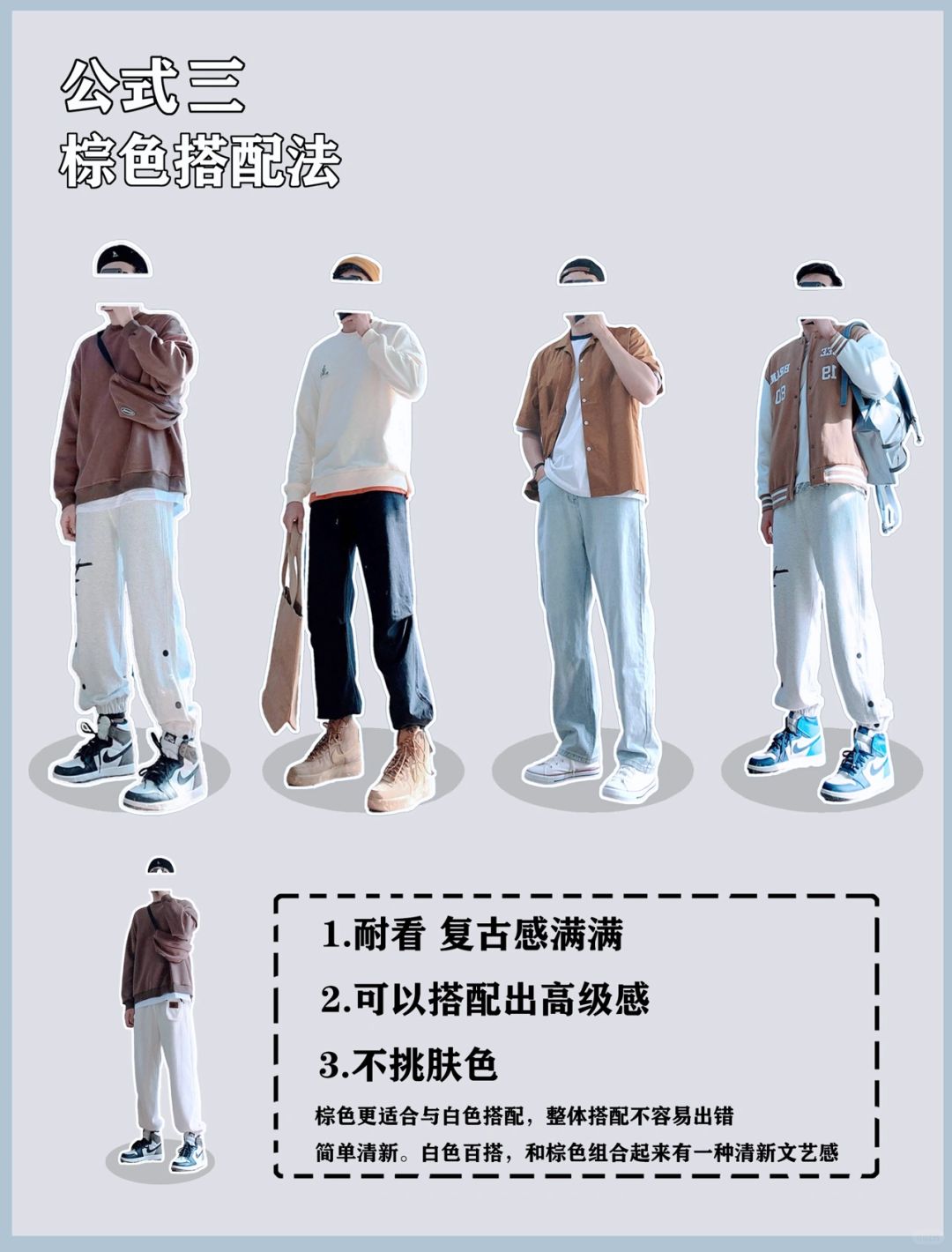 3⃣️招轻松变帅提高衣品|干货必看‼️显高技巧 【干货分享篇】 1⃣️:适合男生不挑人的配色公式主要有三种: ◼️ 黑白搭配法 ◼️ 蓝白搭配法 ◼️ 棕色搭配法 详细说明均在图片、适合各种身材与肤色、适合小白拿来就用‼️ 2⃣️:叠穿法则 叠穿的好处不弄多说、增加层次感、让整体更吸睛、想要提升衣品就要学会叠穿‼️ 3⃣️:显高技巧 显高主要在于款式的把控、裤装的选择尤为重要‼️ 避免穿出五五开或者四六开⚠️
