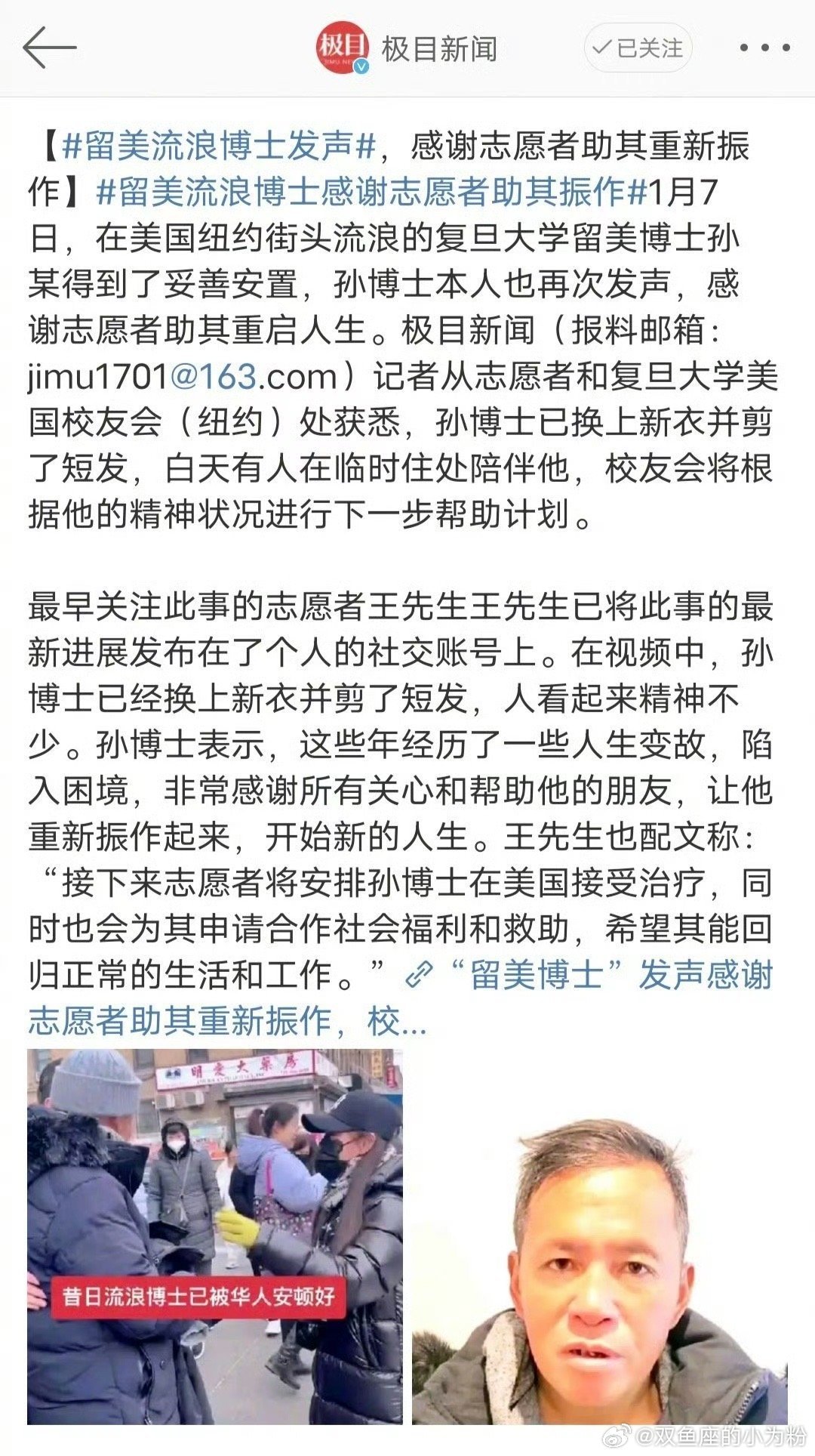 #家属已知复旦留美博士流浪纽约街头# 孙卫东有人帮助,也想振作起来,这是我们希望看到的,希望复旦纽约校友会,再接再励,把事做扎实,让他在美国重回正常生活。