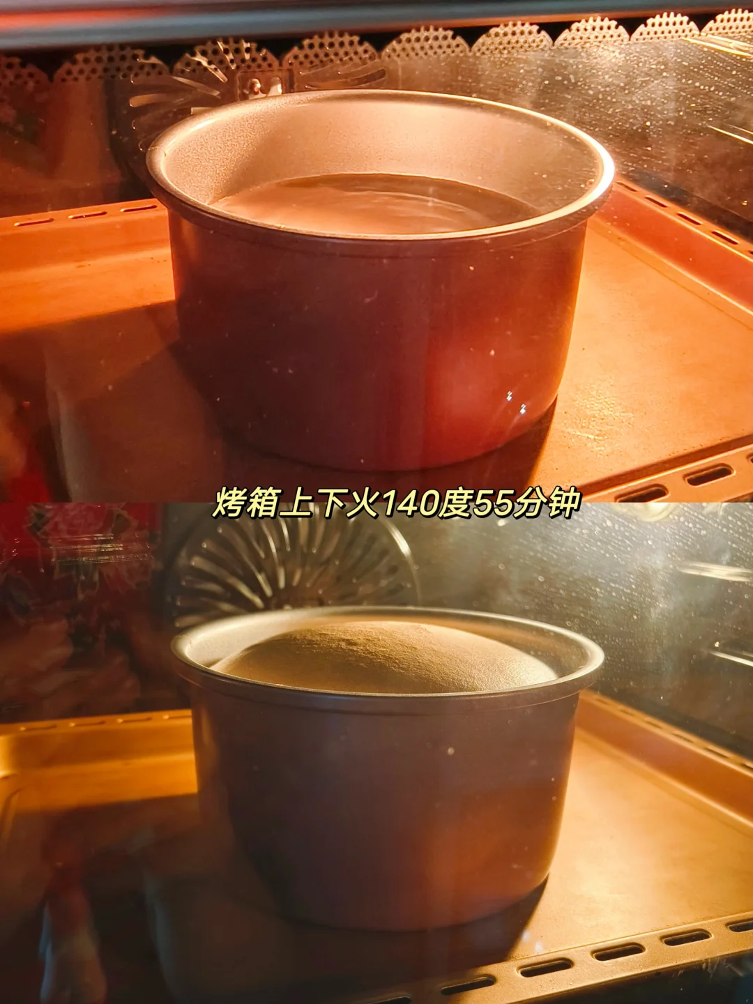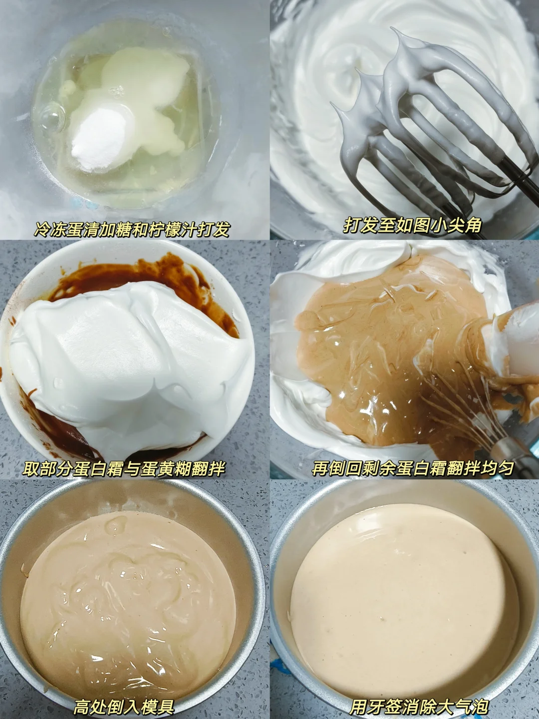 [四R]取三分之一蛋白霜与蛋黄糊混合,手法是翻拌!再倒回剩余的蛋白霜里面,继续翻拌均匀,高处倒入模具7分满,用牙签搅一下除去大气泡,震几下送入烤箱,烤箱上下火140度55分钟,出炉后震几下,倒扣,这点很重要哦,直至晾凉再脱模,不要着急脱模。