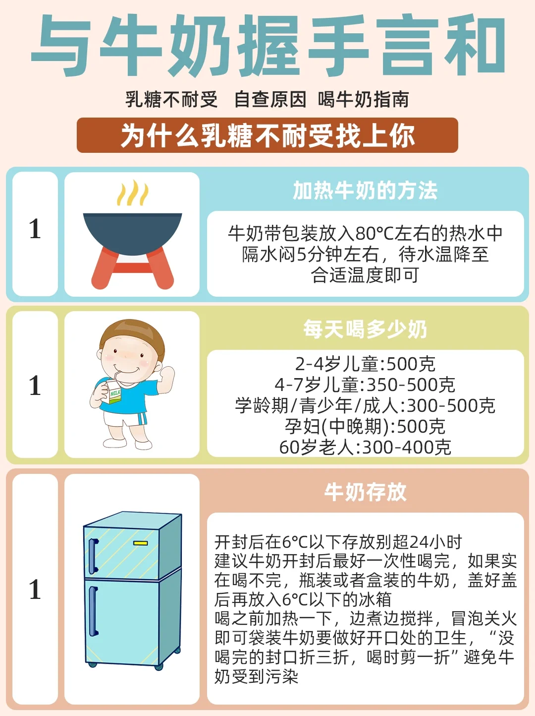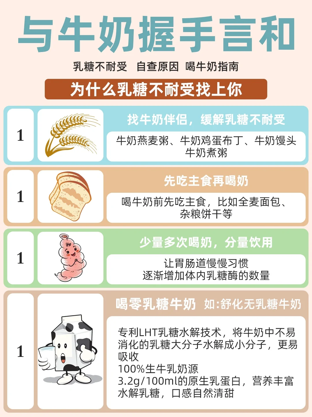 🔍乳糖不耐受是什么? 乳糖不耐受是指由于肠道分泌的乳糖酶减少,不能够完全的消化、分解母乳或者牛乳当中的乳糖,而引起非感染性的腹泻。 ⁉️乳糖不耐受的症状: 1.每次奶后半小时内腹泻 2.肚子有咕噜噜的肠鸣音 3.伴随肠绞痛、腹痛、哭闹不安 4.放屁崩,放屁多又臭,嘴巴酸臭 5.有些宝宝会便秘、胀气、吐奶表现 6.观察便便,看有无奶瓣、蛋花、水便分离、泡沫状 💢乳糖不耐受是多发在亚洲地区的一种先天的遗传性表达。 🔸亚洲人群的发生率高达60%,是指人体内不产生分解乳糖的乳糖酶,而导致乳糖不能被消化吸收和被人体所利用。 💢乳糖不耐受有三种类型 1⃣先天性乳糖酶缺乏 乳糖酶先天性缺乏或活性不足,这种类型在过去很少见,但近年来呈逐渐增多趋势; 2⃣继发性乳糖酶缺乏 这是一种暂时性疾病,由于肠绒毛顶端受损而出现乳糖酶缺乏,导致出现腹泻等症状,康复后可恢复正常 3⃣原发性乳糖酶缺乏 又称「成人性乳糖酶缺乏」,是最常见的一种类型,随着年龄增长和饮食改变,乳糖酶活性下降直至消失,引起乳糖不耐受或吸收不良。 🤔想喝牛奶但是不确定自己耐受量是多少怎么办? 1️⃣少量多次饮用牛奶 建议从50ml开始逐渐增加,可帮助肠道逐步适应。最好再搭配面包等固体食物,可“稀释”牛奶中的乳糖浓度,缓解或避免不适症状。 2️⃣避免空腹饮用牛奶 空腹时牛奶在胃肠道通过的时间短,乳糖不能很好地被吸收,易加重乳糖不耐症状。建议在正餐或餐后1-2小时内饮奶。 3️⃣选择低乳糖/0乳糖奶 乳糖不耐受的人应选择低乳糖或者0乳糖含量的奶及奶制品,如舒化奶、奶酪、酸奶等。 4️⃣发酵乳代替鲜乳 可以选择用发酵乳来代替平时喝的鲜乳,发酵乳中的乳糖已有20%-30%被降解,除了不会出现乳糖不耐受的情况,同时还有利于消化吸收,食用酸奶还能改善乳糖消化不良和乳糖不耐受。